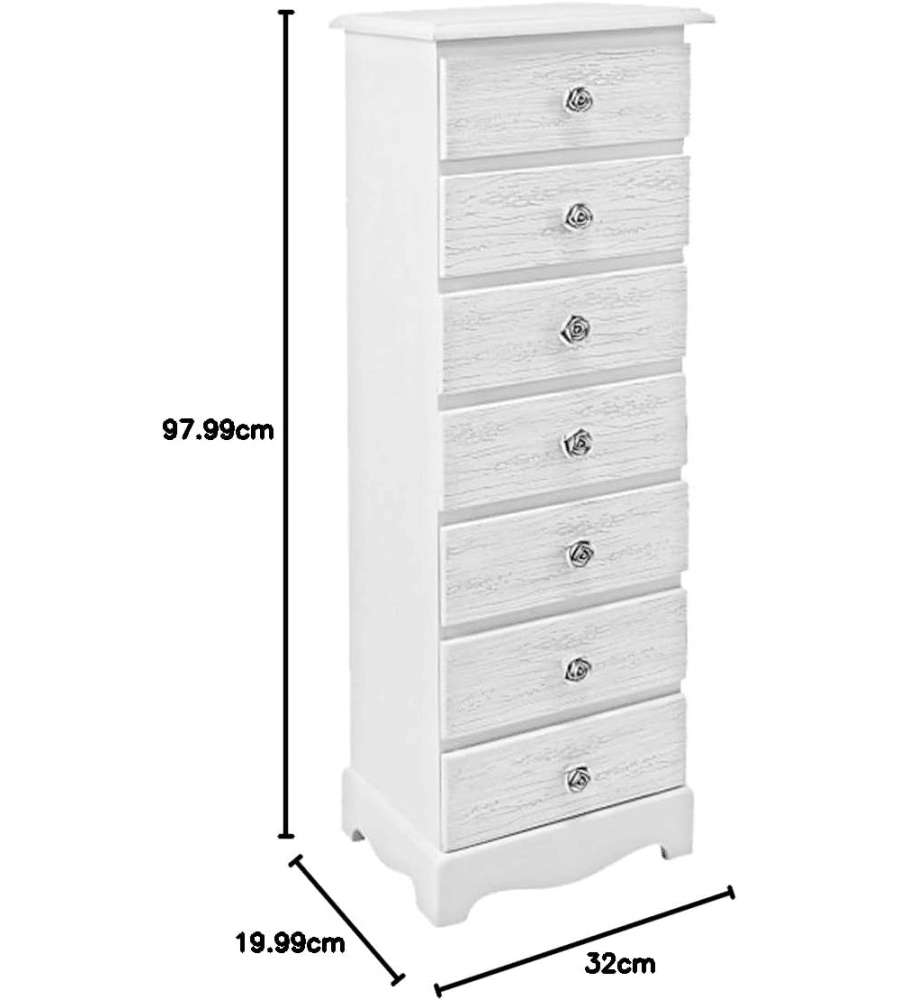 Cassettiera in MDF bianco opaco con 7 cassetti, dimensioni 29x23x89 cm. Finitura decapata e maniglie a rosa in poliresina, ideale per organizzare spazi con stile. Design elegante adatto a vari ambienti domestici.Cassetti: