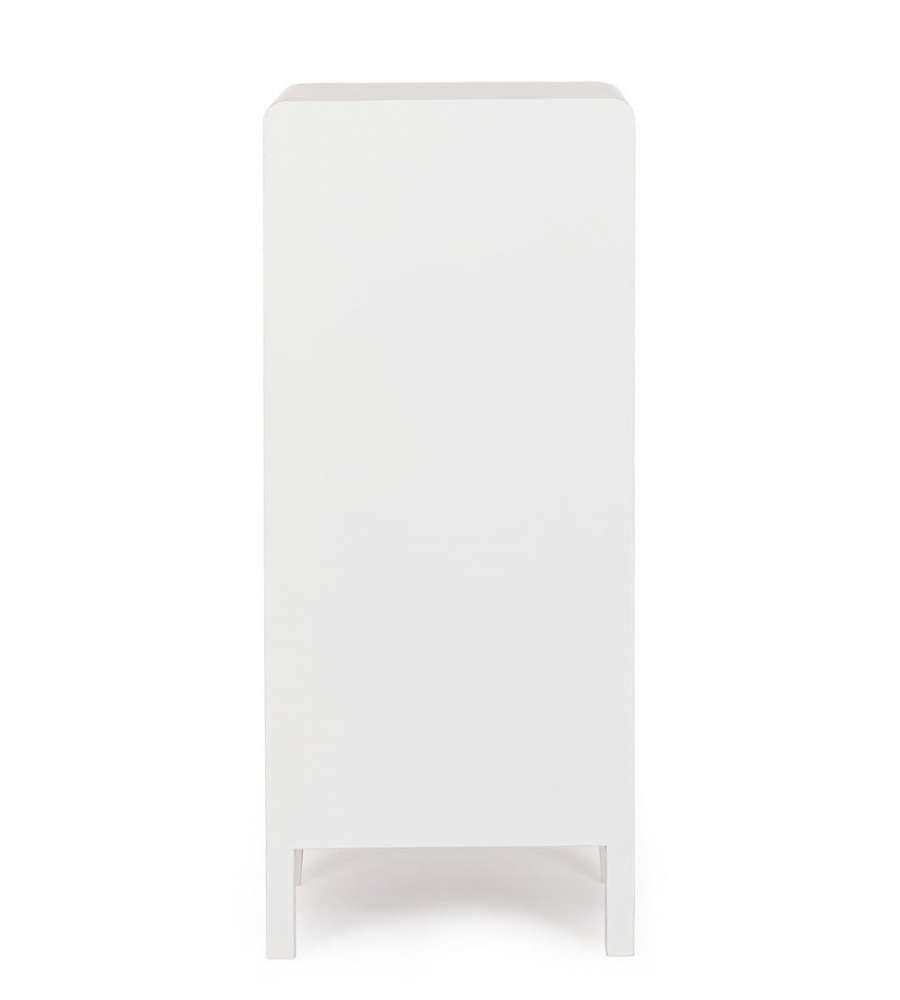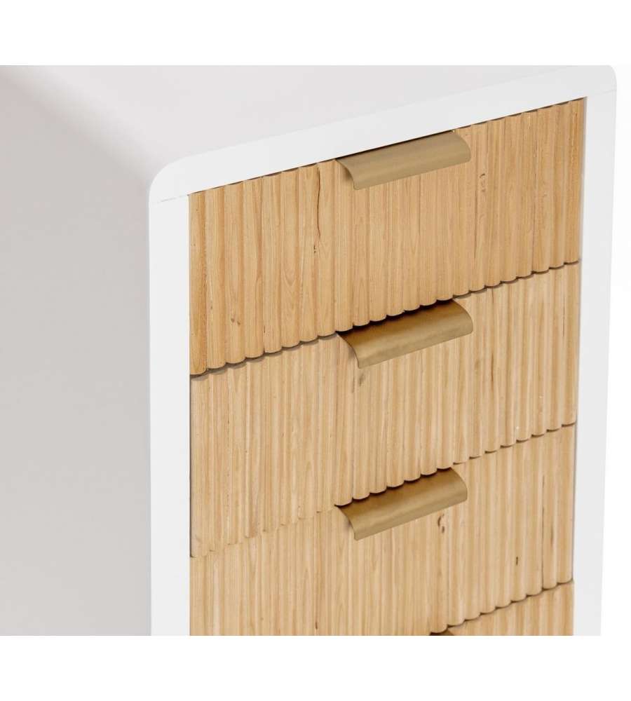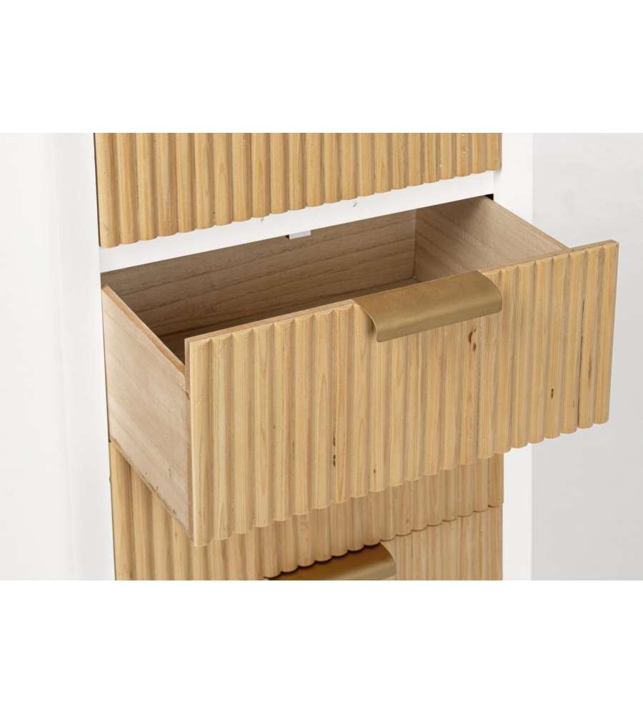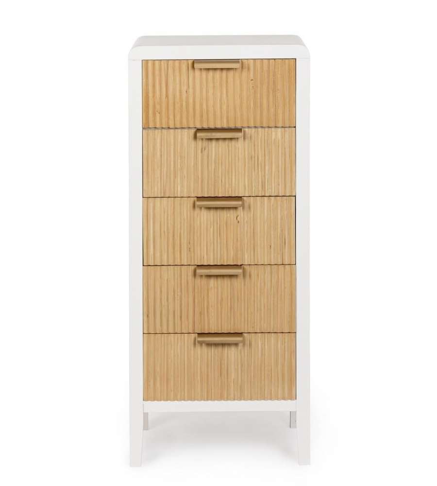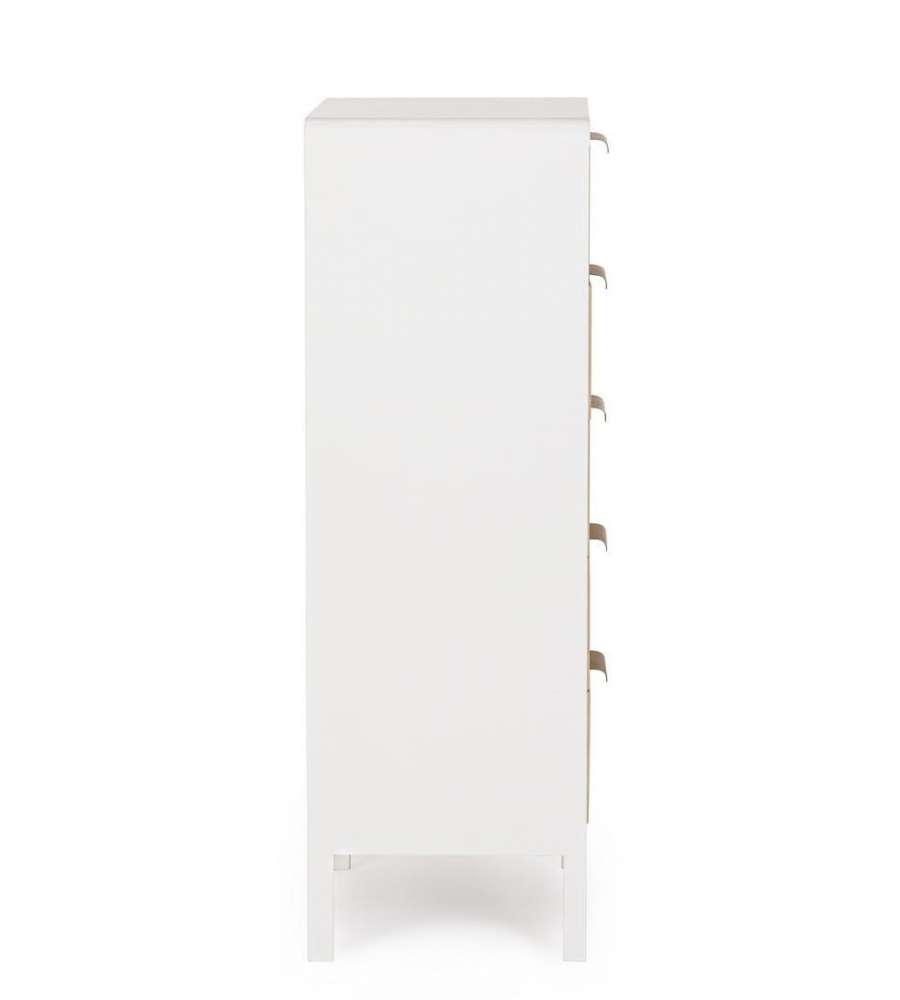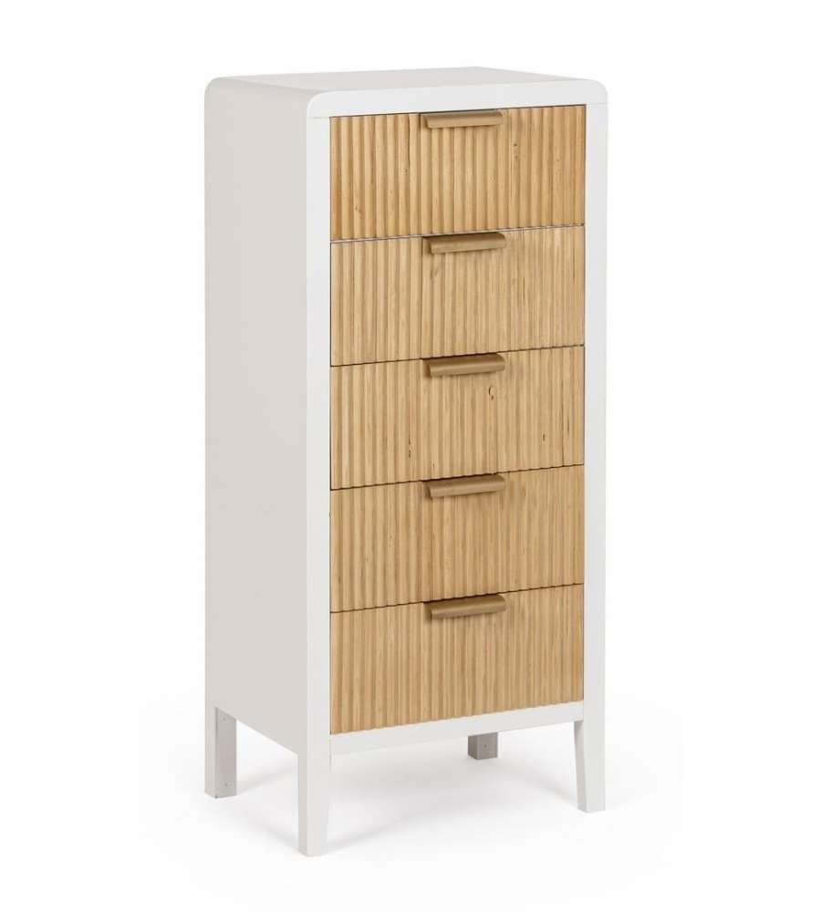 Descrizione: Cassettiera Charley Bizzotto 40x92 cm in bianco e legno naturale, ideale per organizzare abiti e accessori. Con 5 ampi cassetti in paulonia e maniglie in acciaio, unisce eleganza e funzionalità.