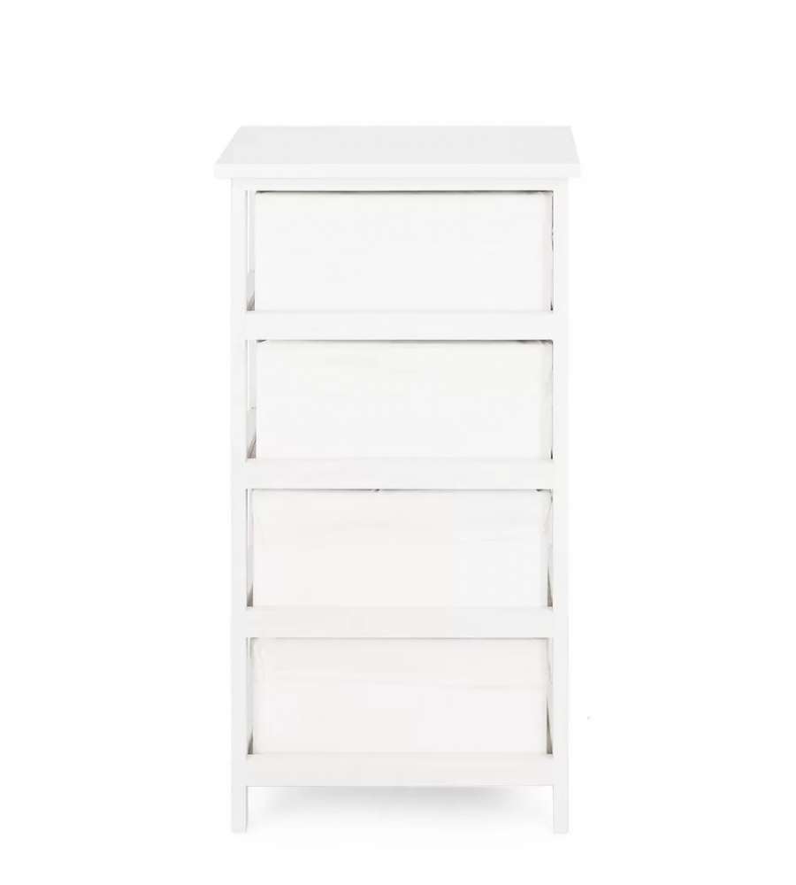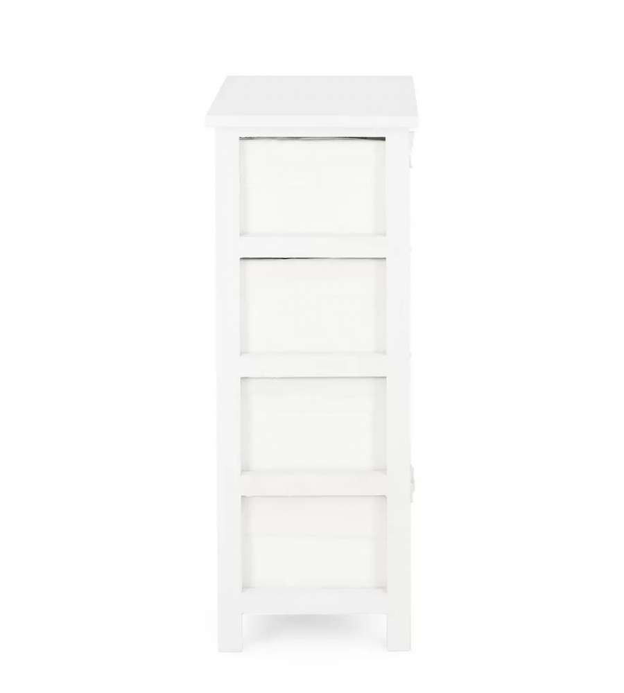Cassettiera in legno di paulonia e compensato, con finitura shabby chic. Dotata di 4 cassetti con pomelli a forma di fiocchi. Dimensioni compatte 40x29x73h cm, ideale per organizzare spazi piccoli con stile.Cassetti: