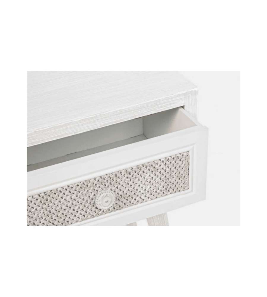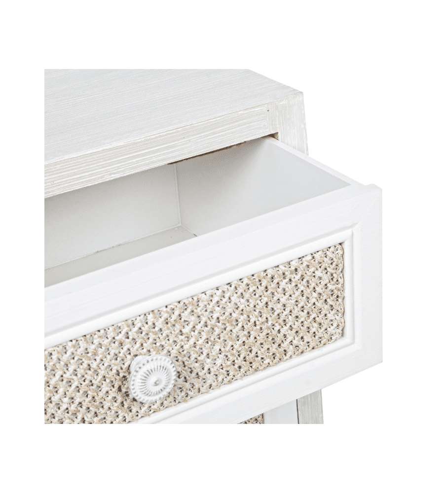 Mobiletto elegante in MDF con finitura a base d'acqua e cassetto rivestito in tessuto cotone/lino. Dimensioni compatte (35x30x46,5 cm), piedini da assemblare, ideale per spazi ridotti e per ogni ambiente interno.Cassetti: