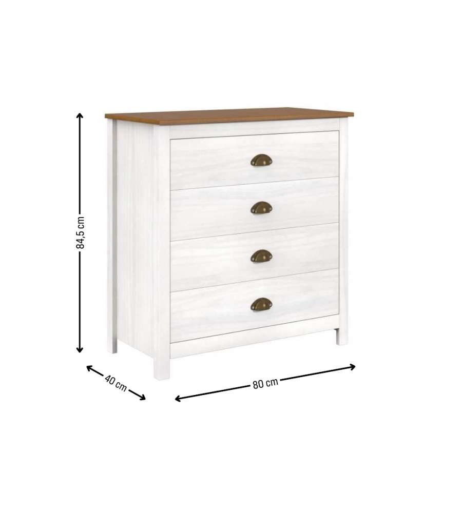 Cassettiera Topazio bianca con 4 cassetti e maniglie in ottone invecchiato. Dimensioni: 80 x 40 x 84,5 cm. Capacità di carico: 5 kg per cassetto. Elegante e funzionale, ideale per ogni ambiente.Portata: