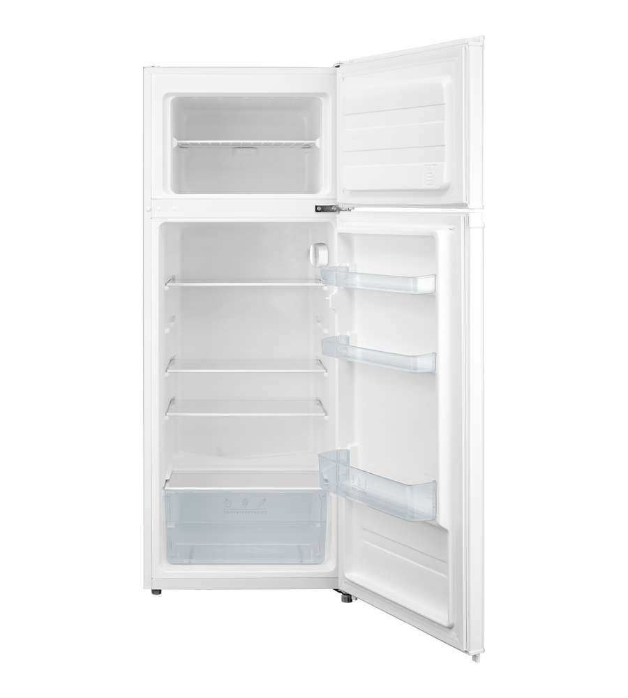 Frigorifero a doppia porta Daya con capacità totale di 204L, classe E, controllo elettronico e funzione Super Cooling. Design compatto e silenzioso (40 dB), 3 ripiani in vetro, porte reversibili e luce LED interna. Efficienza e praticità garantite.Capacità: