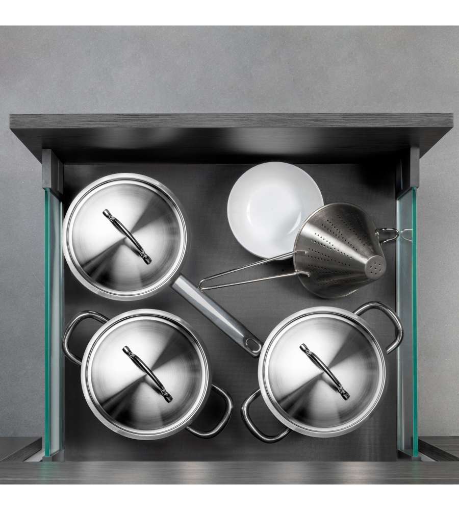 Cassetto Vertex con sponde in vetro trasparente per i mobili della cucina. Presentano un design elegante dalle linee rette in colore grigio antracite e sono disponibili in diverse altezze e profondità dei cassetti.