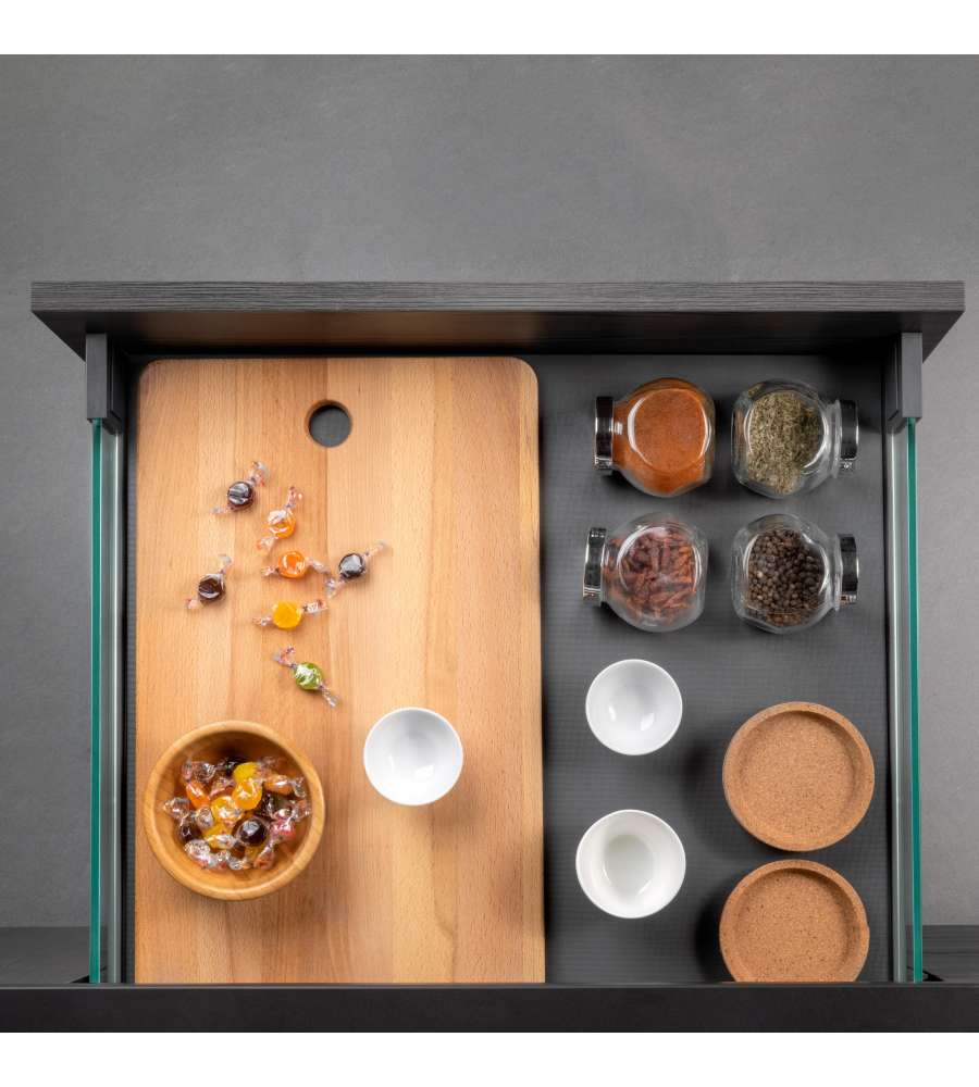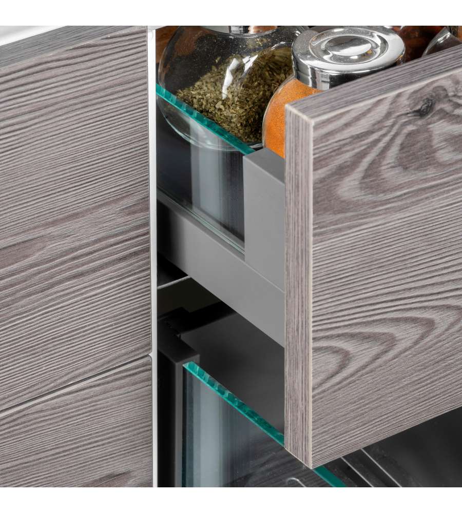 Cassetto Vertex con sponde in vetro trasparente per i mobili della cucina. Presentano un design elegante dalle linee rette in colore grigio antracite e sono disponibili in diverse altezze e profondità dei cassetti.
