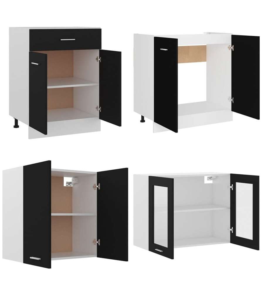 Set di 4 armadi da cucina in truciolato nero. Include vetro, richiede assemblaggio. Dispositivo anti-ribaltamento incluso.I dati sottostanti riguardano la sede legale e le Informazioni correlate del produttore del prodotto.