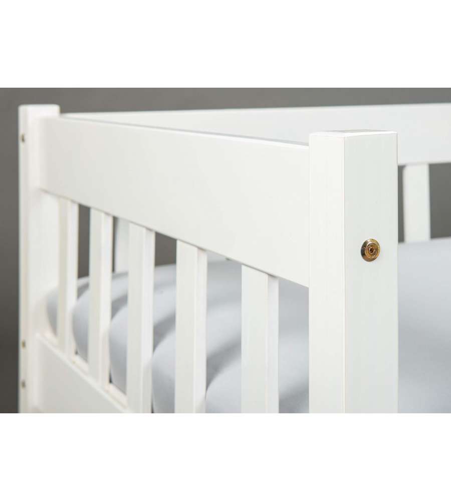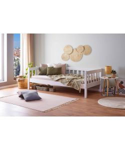 Divano letto singolo 90 x 200 in legno di pino massello. Include rete a doghe. Design con sponde, colore bianco. Ideale per spazi ridotti e come letto aggiuntivo.Spedizione gratuita:
