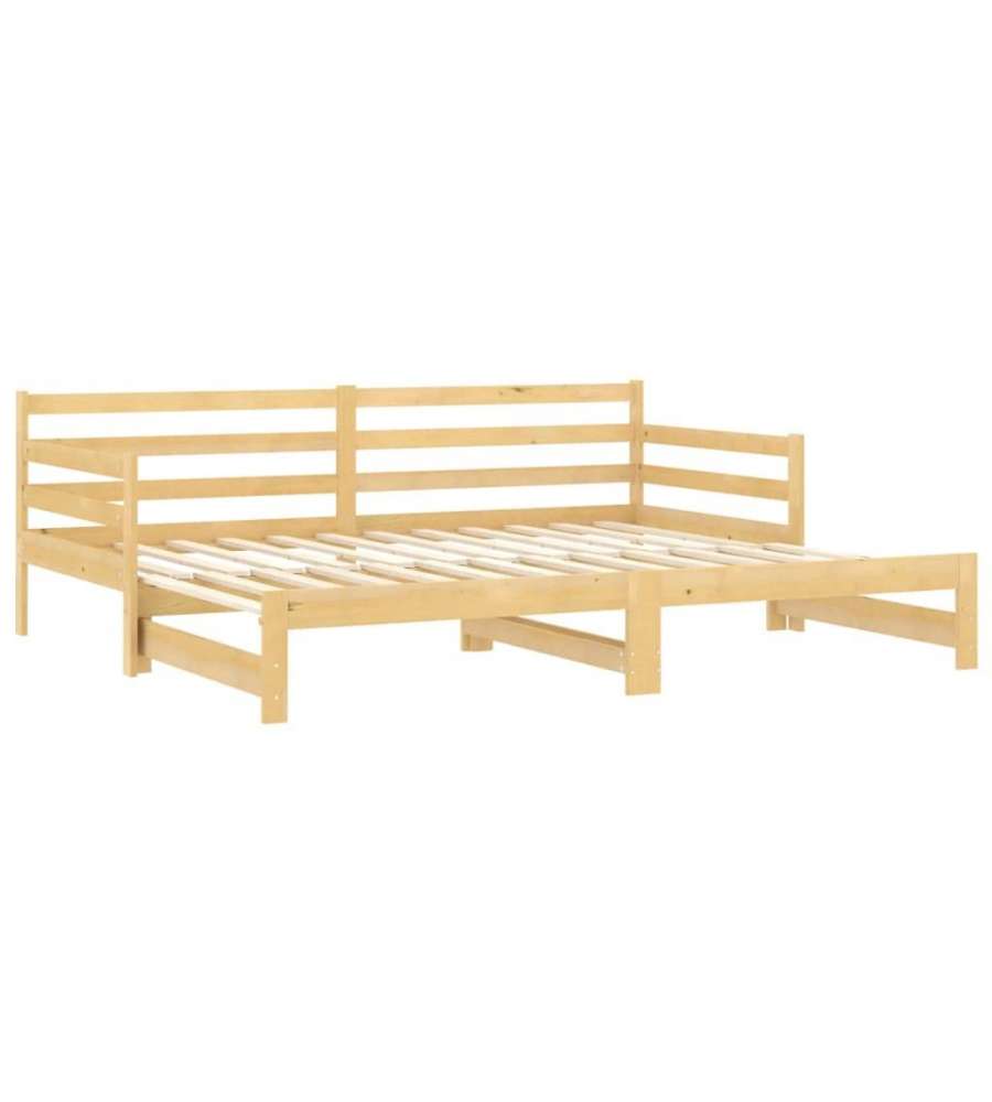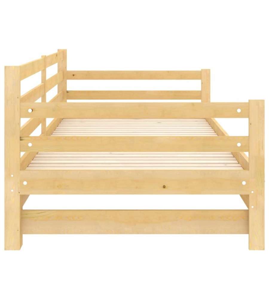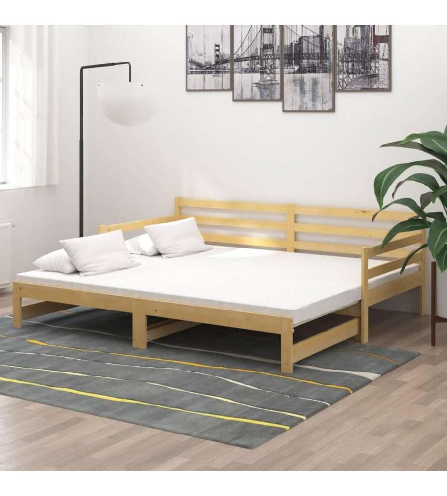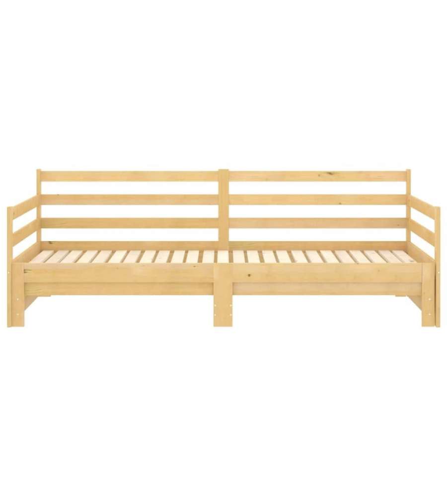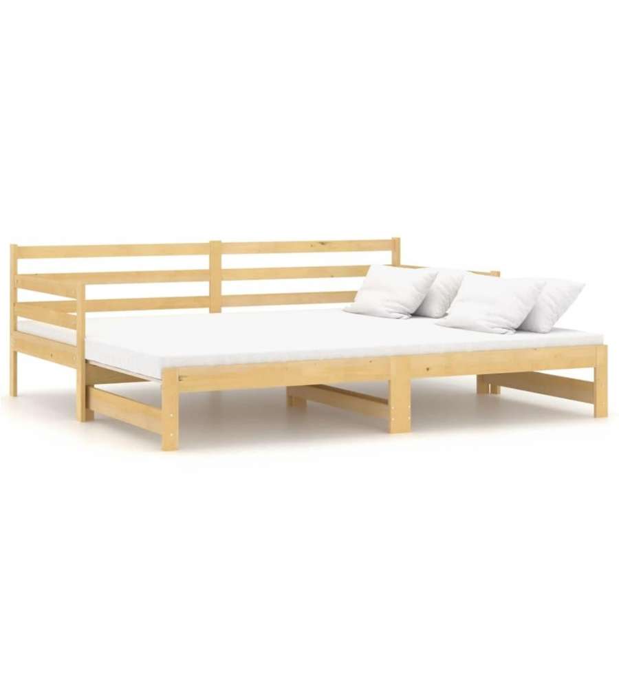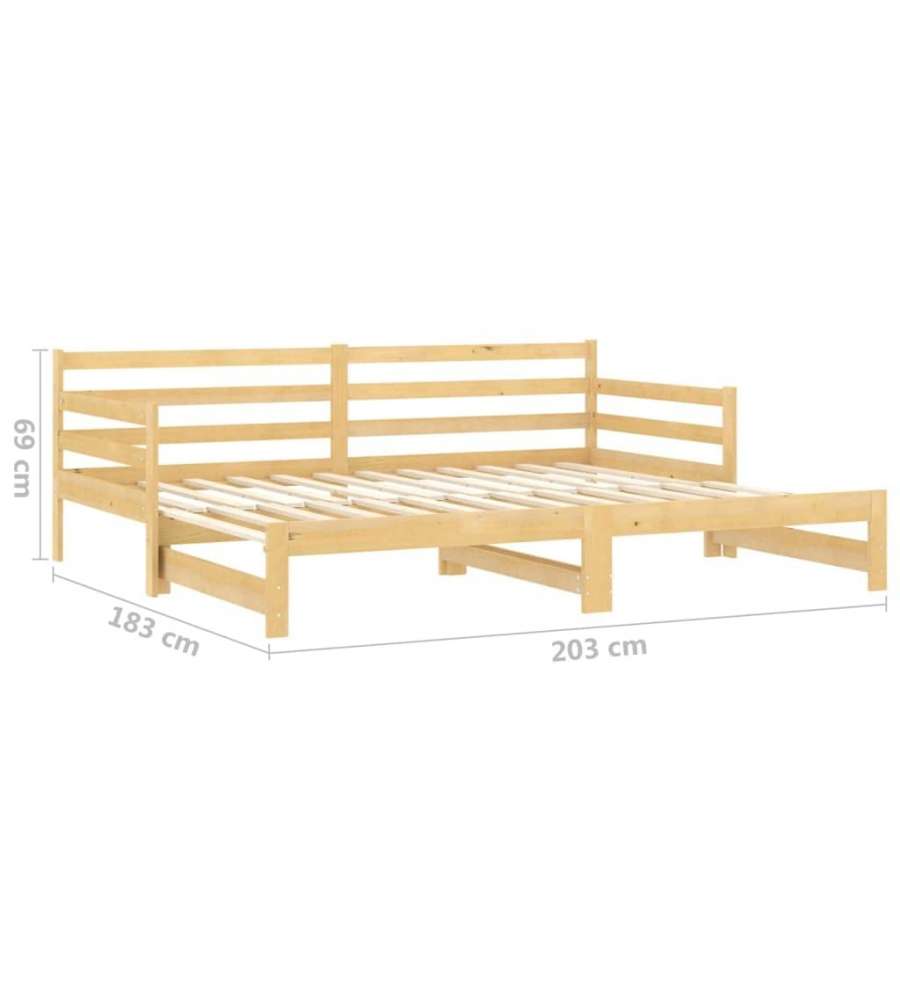 Dormeuse estensibile in legno massello di pino, 2x(90x200) cm. Funziona come divano di giorno e letto di notte. Dimensioni estese: 203x183x69 cm, non estese: 203x98x69 cm. Altezza da terra: 21 cm.