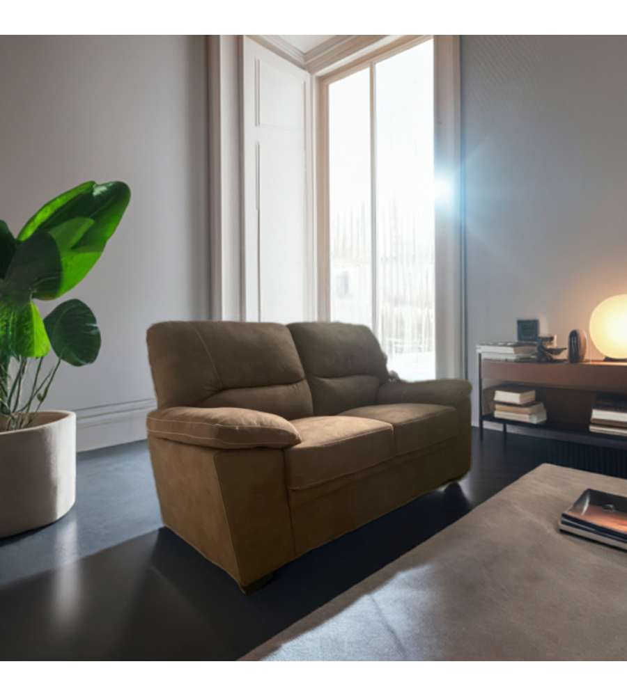 Elegante divano a due posti in nabuk beige con piedini. Perfetto per soggiorni moderni, unisce stile e comfort in dimensioni compatte. Facile da pulire e ideale per piccoli spazi.