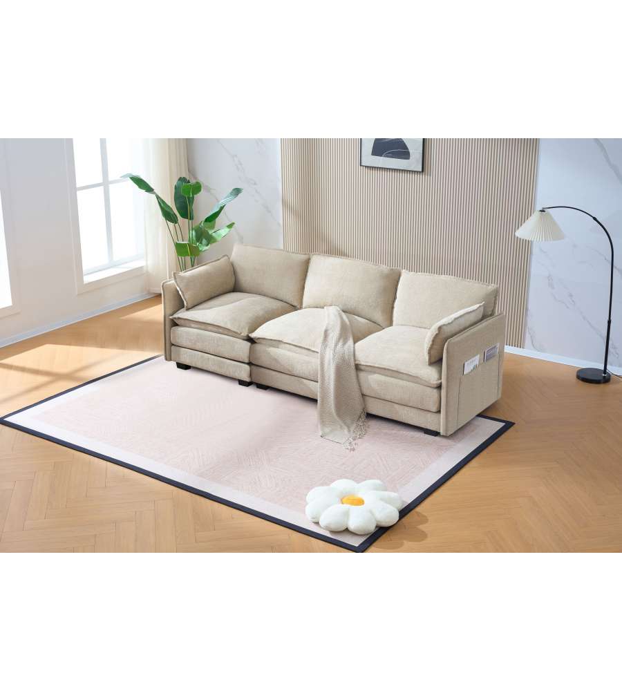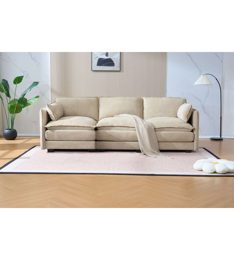 Divano 3 posti modulare in ciniglia beige, dimensioni 253x89x87 cm, imbottitura multi-strato con molle insacchettate per comfort ottimale. Design Japandi, piedi in legno nero, tasche porta riviste integrate. Garanzia 12 mesi.Altezza seduta: