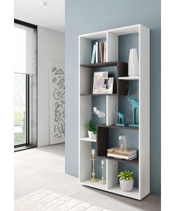 Libreria Kawa con 8 scomparti in melaminico, colori bianco artik e ossido. Dimensioni: 180x80x25 cm. Ripiani fissi, portata max 30 kg. Include kit di montaggio e dispositivi di fissaggio a parete.Portata: