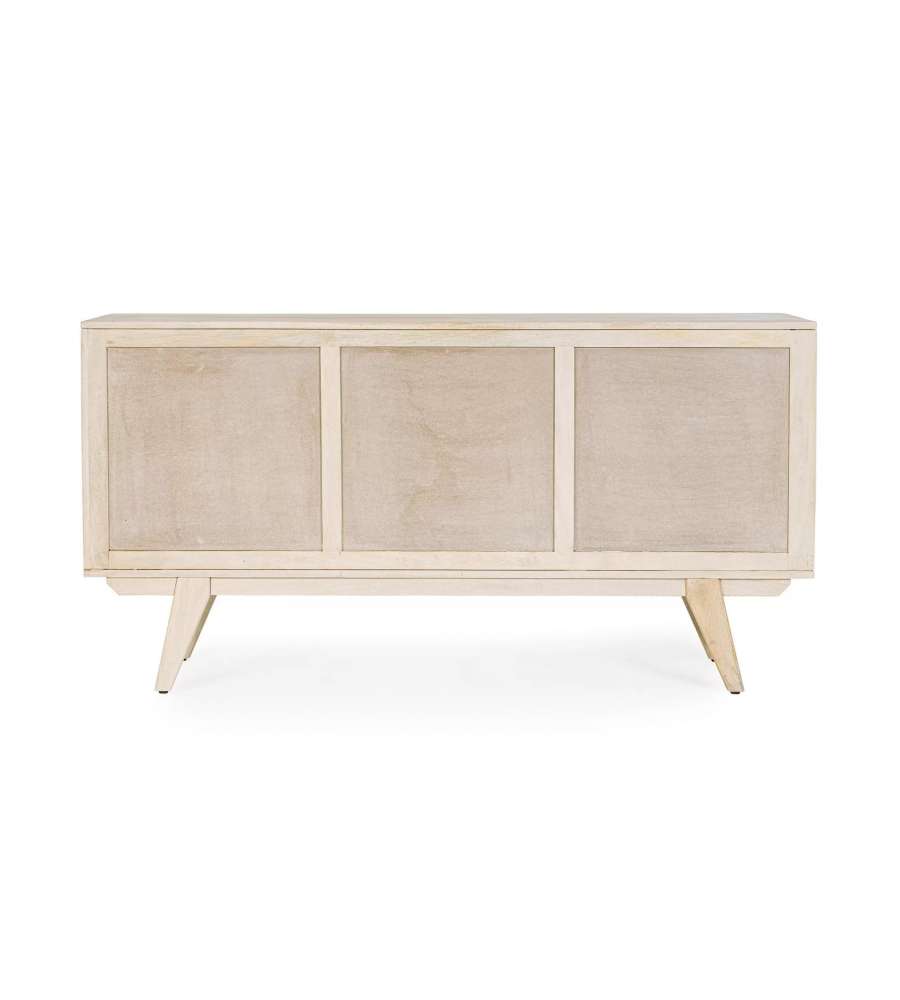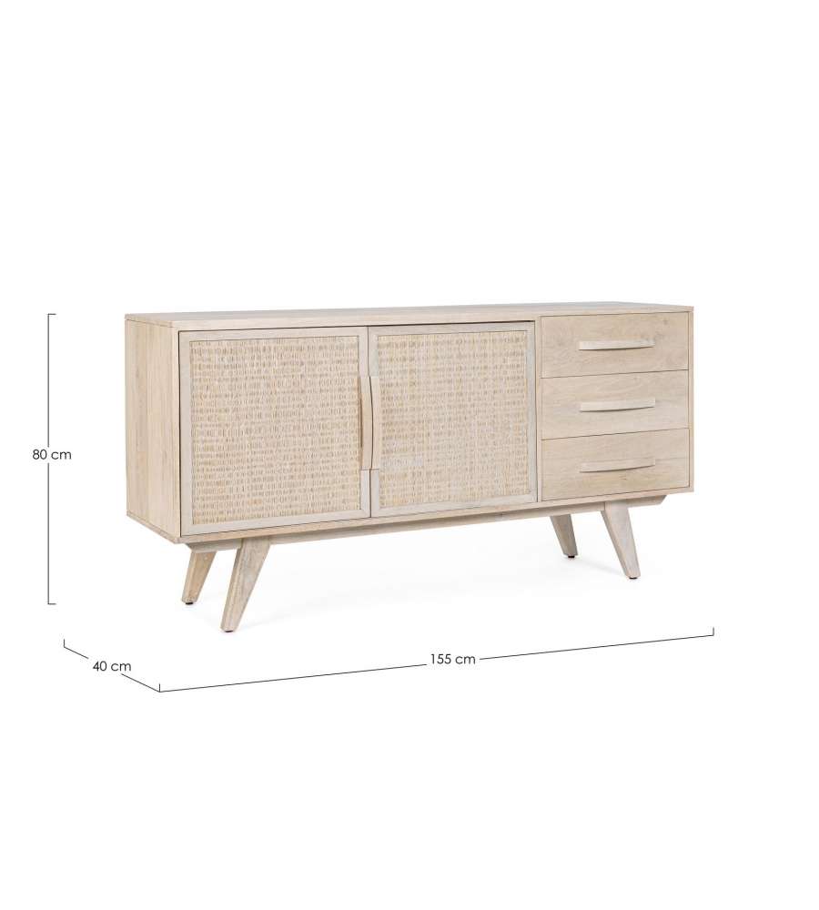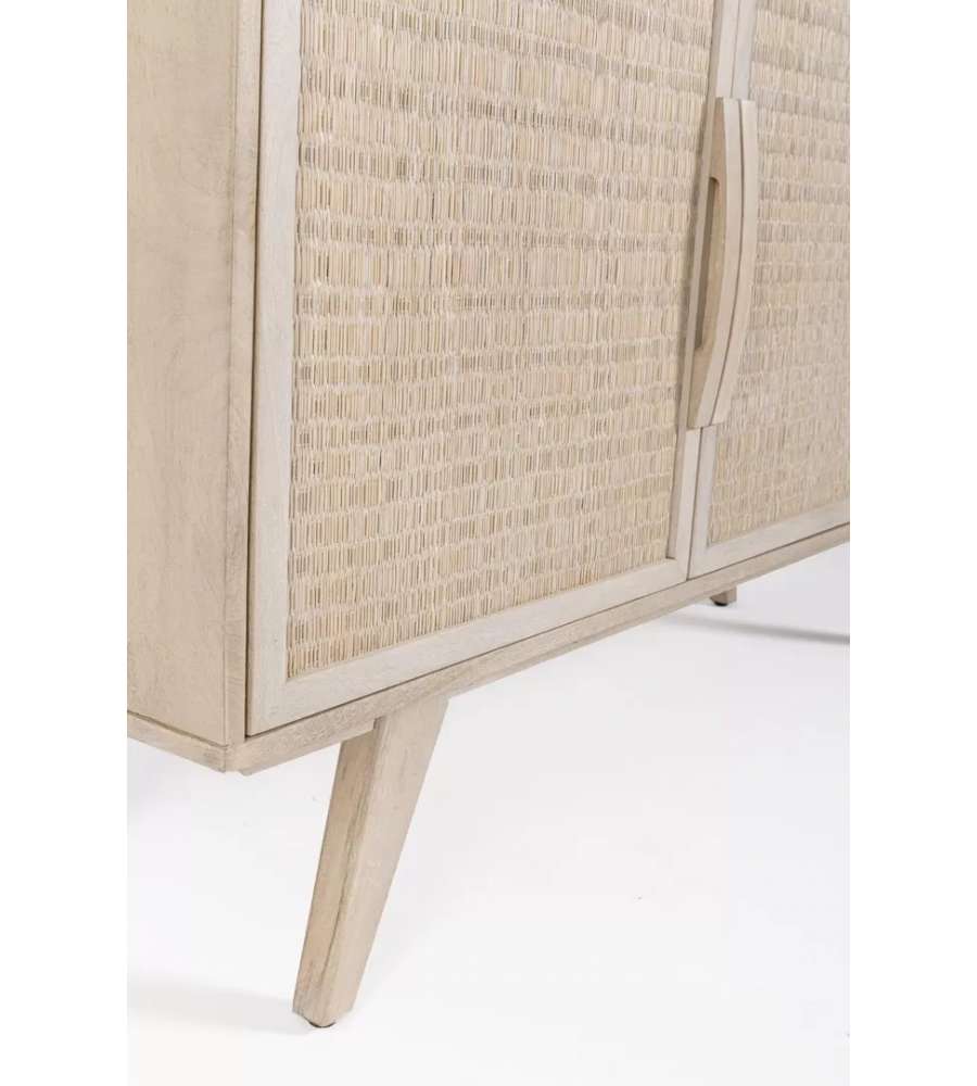Credenza in legno di mango con ante in rattan e finitura bianca. Struttura robusta, con fondo cassetti in MDF e vano con mensola. Stile naturale, peso 51 kg. Piedini da assemblare per una maggiore stabilità.Cassetti: