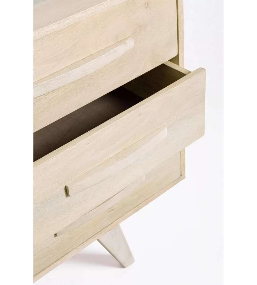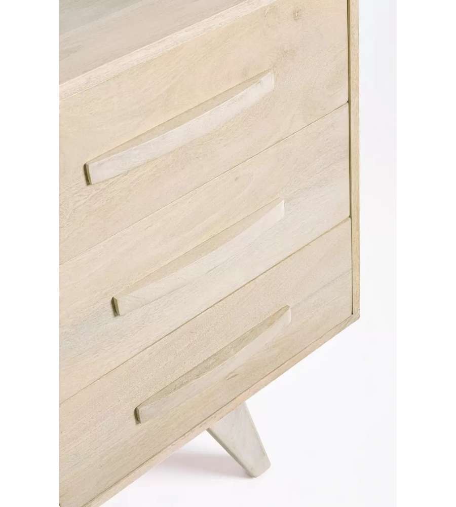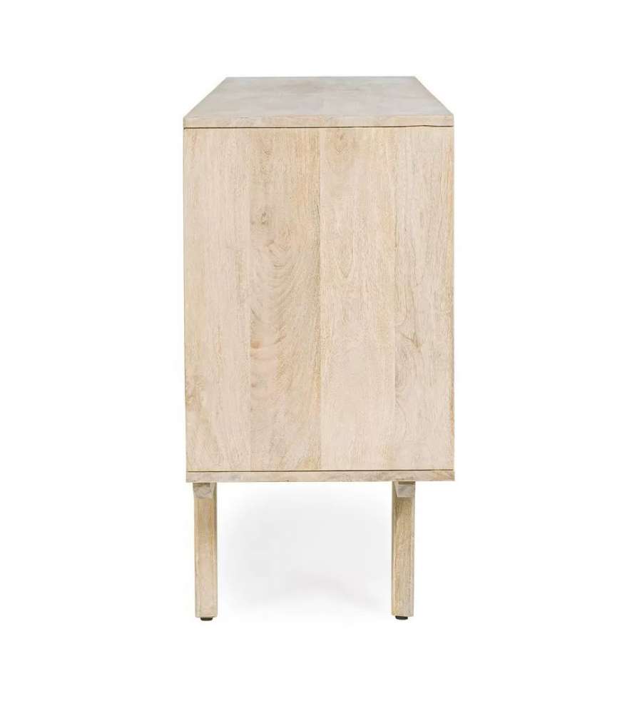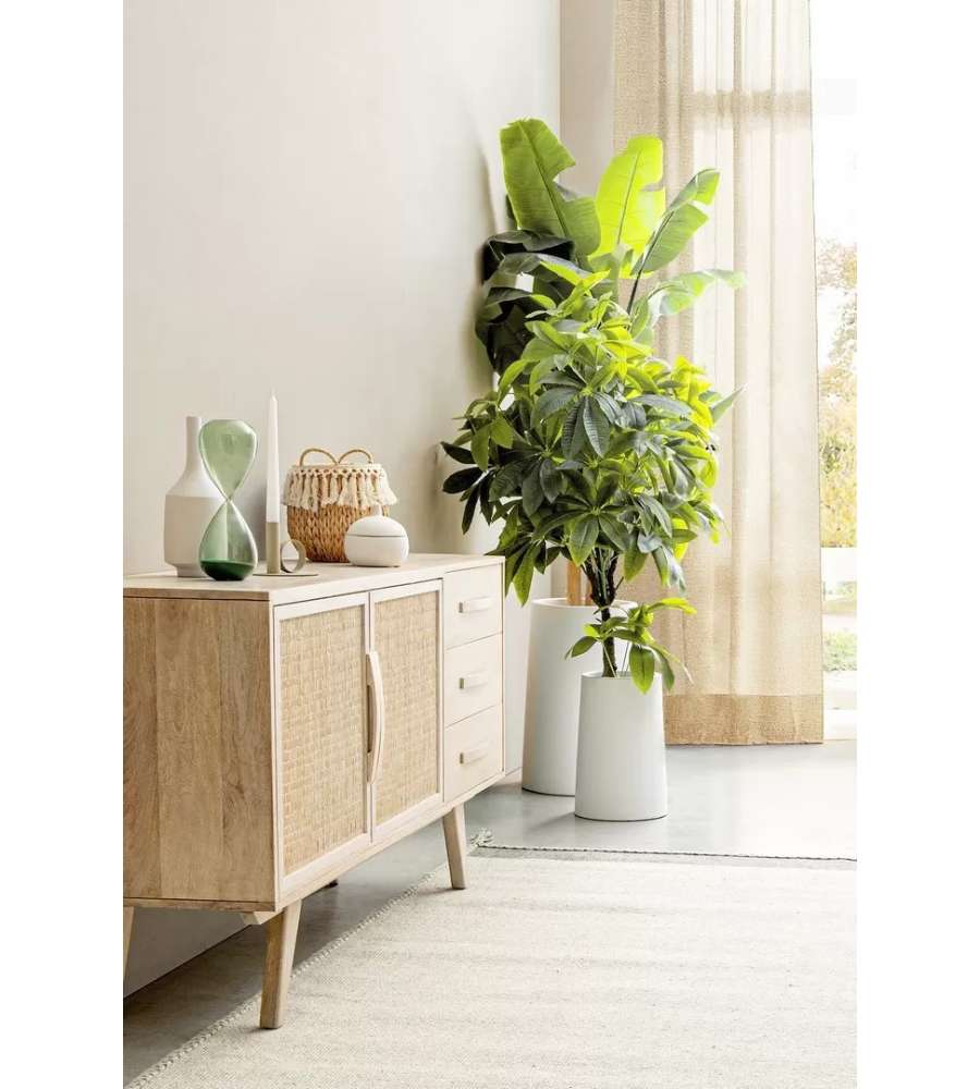 Credenza in legno di mango con ante in rattan e finitura bianca. Struttura robusta, con fondo cassetti in MDF e vano con mensola. Stile naturale, peso 51 kg. Piedini da assemblare per una maggiore stabilità.Cassetti:
