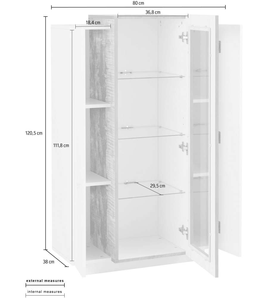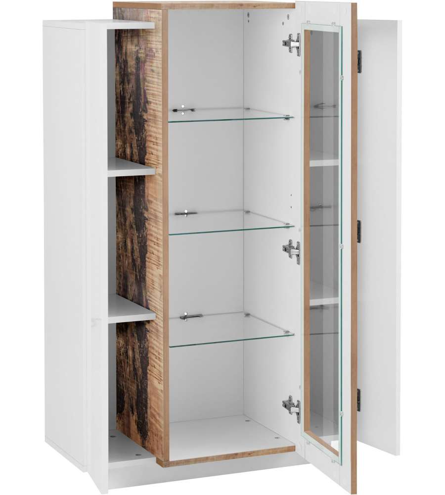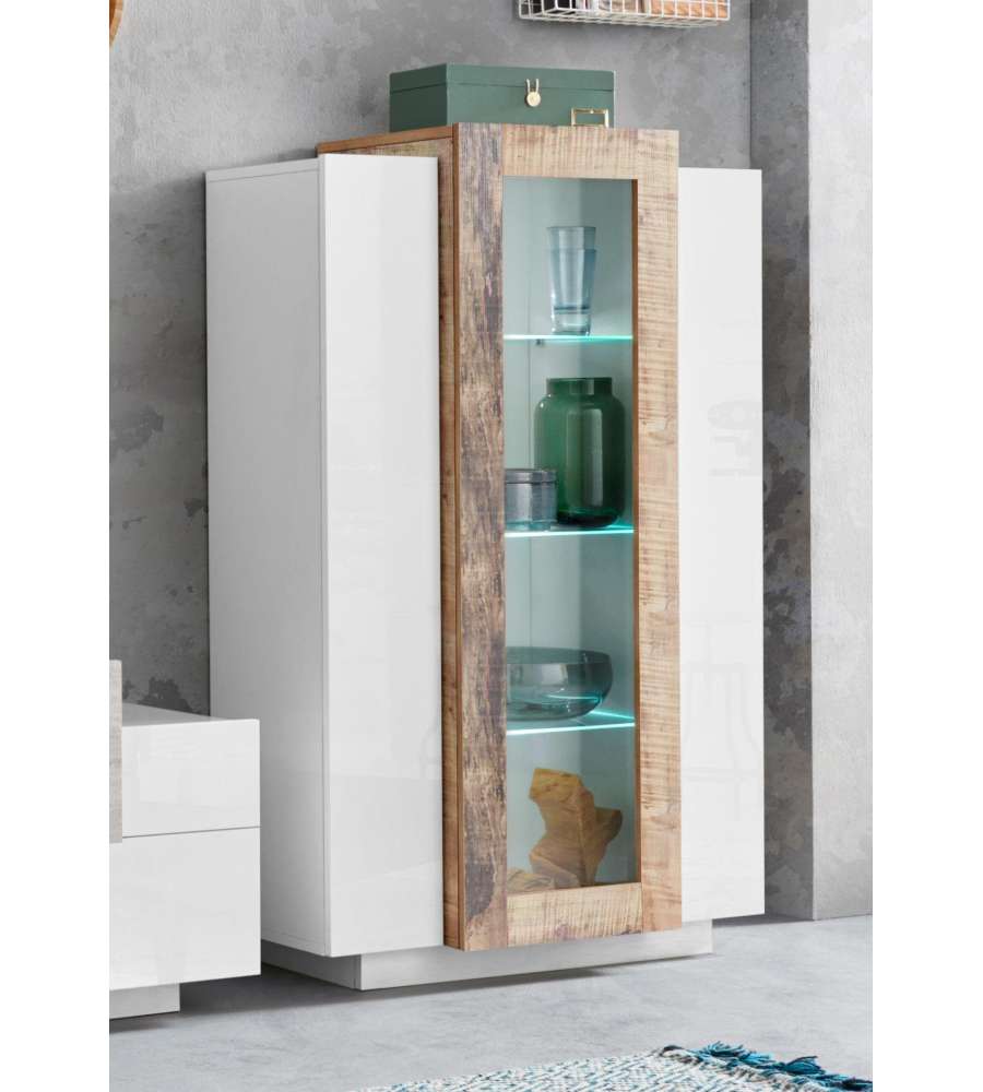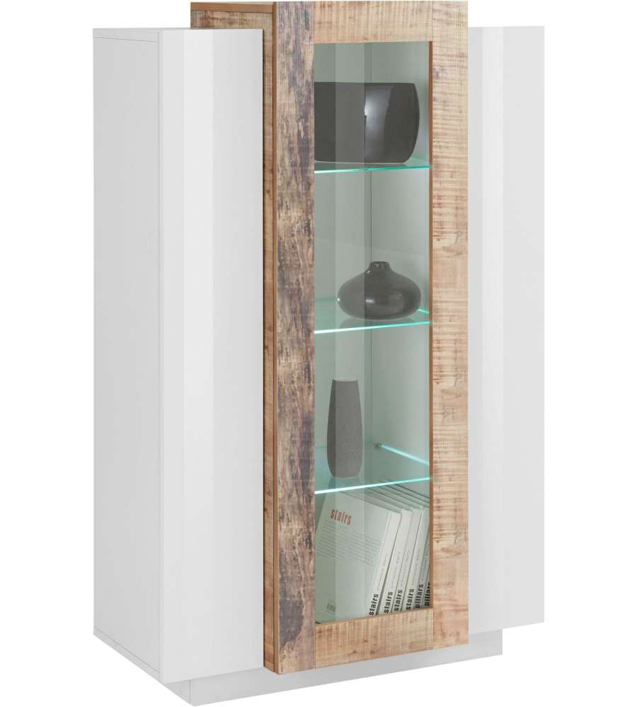 La vetrina CORONA ? un nostro bestseller e trova la sua perfetta collocazione nella zona Living dove unisce estetica, design originale ed elevata funzionalit?, 100% made in Italy. La vetrina ha 2 ante laterali e un?anta centrale di pannello riquadrata con vetro con all'interno 4 ripiani dietro le ante laterali e 3 ripiani di vetro dietro la parte centrale. La struttura ? in melaminico colore bianco e le ante sono in melaminico colore acero pereira e bianco lucido, certificato FSC. Viene fornito in kit di montaggio e dotato di istruzioni semplici e dettagliate.
