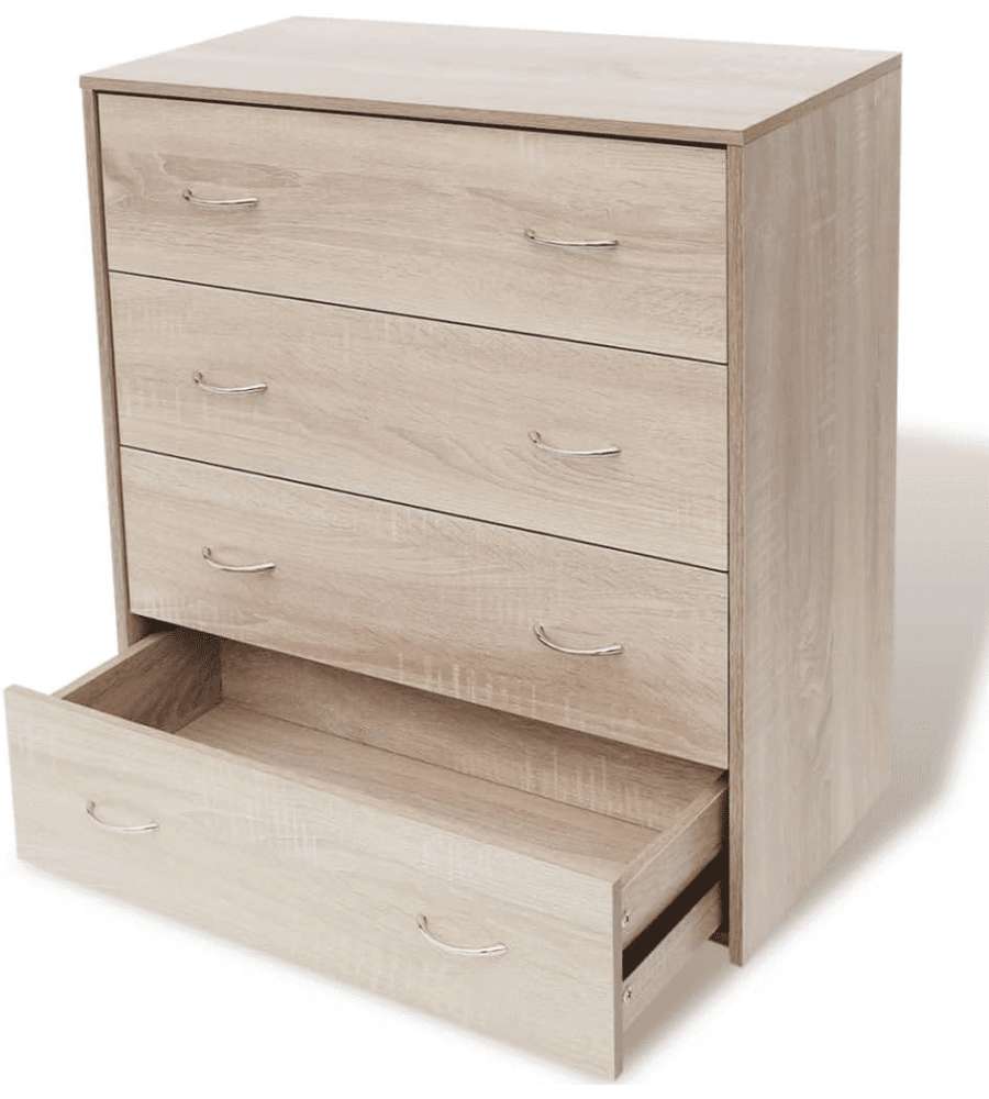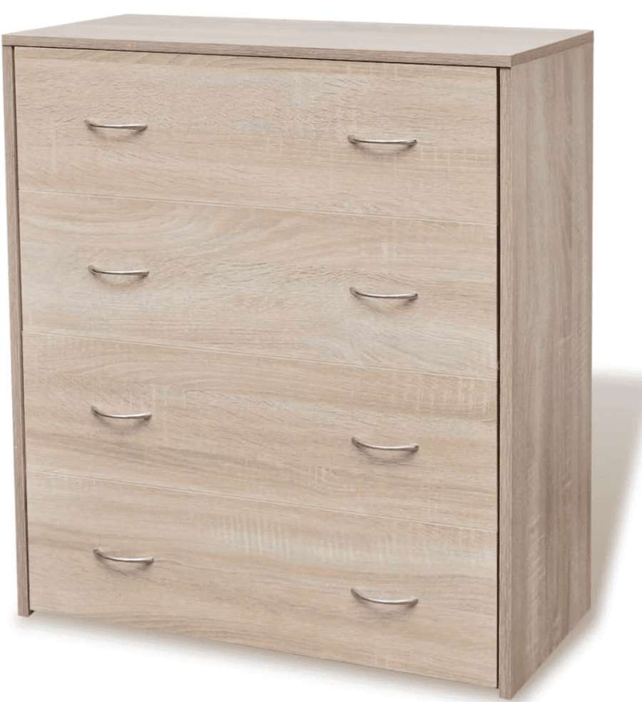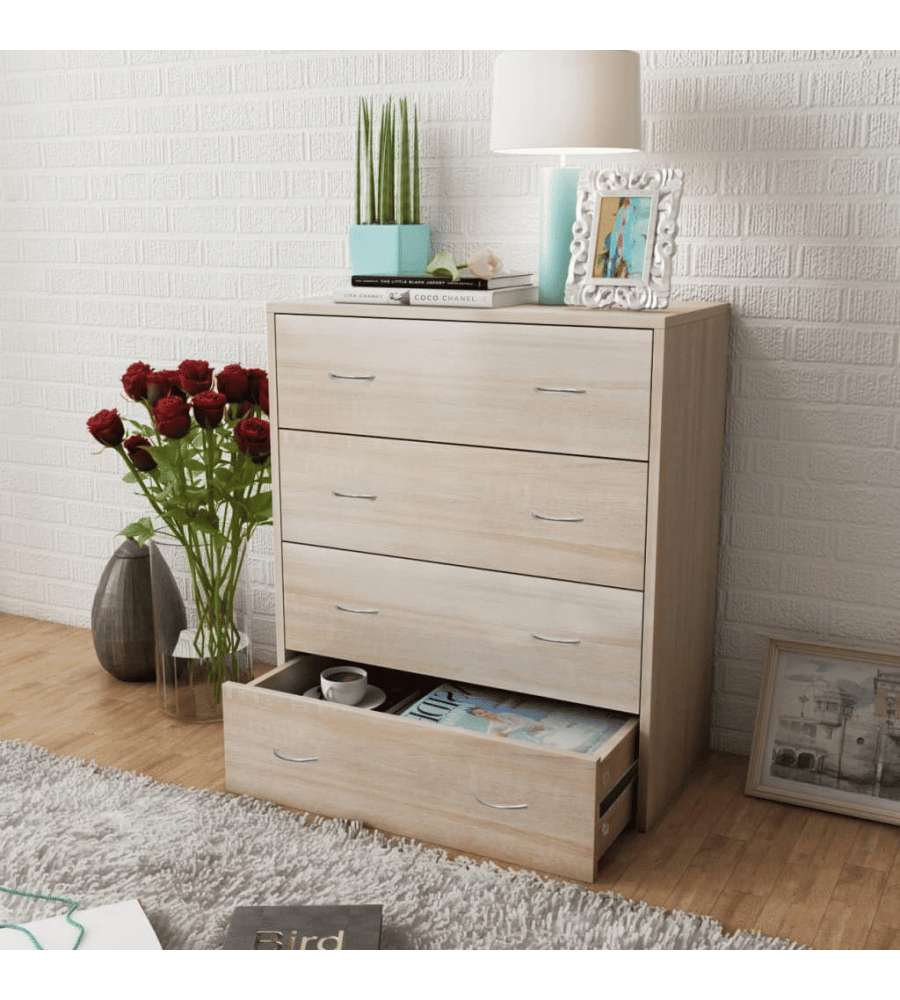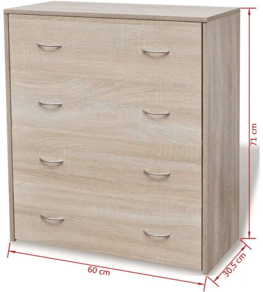 Credenza in rovere con 4 cassetti scorrevoli, dimensioni 60x30,5x71 cm, ideale per soggiorno, sala da pranzo e corridoio. Realizzata in legno multistrato e MDF, resistente e facile da pulire. Accessori di montaggio inclusi.Cassetti: