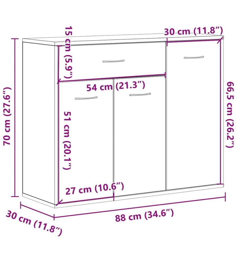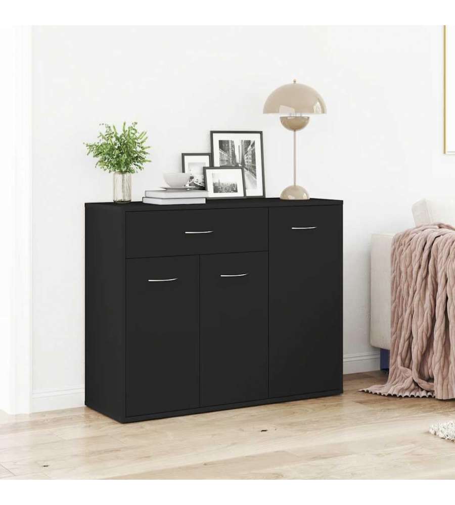 Credenza nera in truciolato con design minimalista, dimensioni 88x30x70 cm. Include 1 ampio cassetto e 3 ante per un'ottima capacità di stoccaggio. Facile da montare e resistente, ideale per ogni ambiente domestico.Capacità: