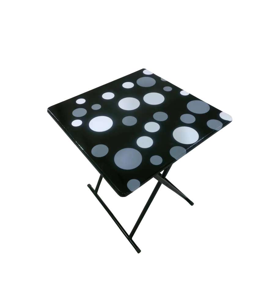 Tavolino pieghevole 60x60 cm con design a pois. Struttura in MDF da 15mm, copertura in PVC verniciato a polvere. Altezza 73 cm, colore nero. Pratico e versatile per ogni ambiente.Uso esterno: