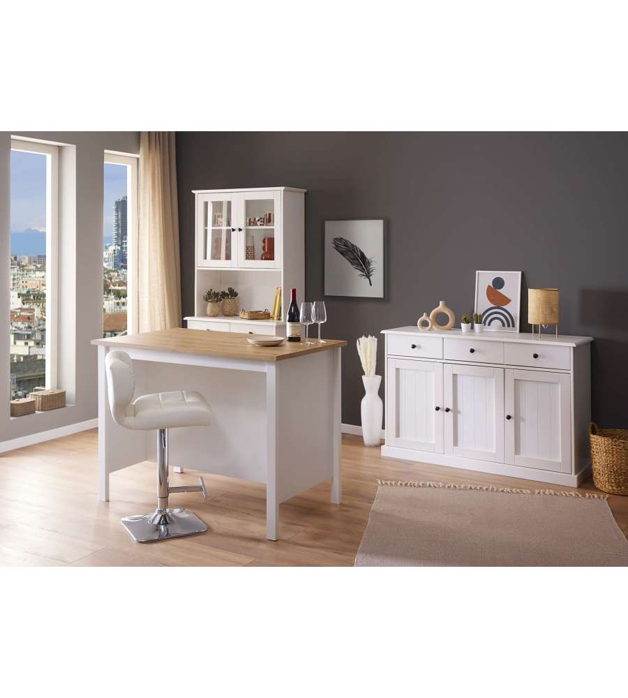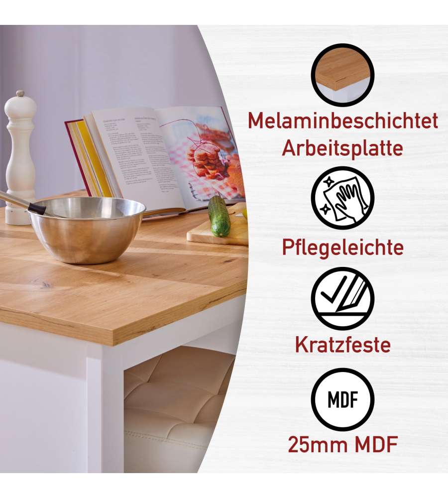 Isola Per Cucina In Laminato Bianco E Quercia Artisan, Con 2 Ripiani E Vano Per Sgabelli. L.124,0 X 75,0 X 91,5 Cm. Articolo In Kit