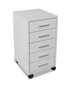 Cassettiera da ufficio bianca con 5 cassetti, realizzata in truciolato e MDF. Dotata di maniglie in alluminio e 4 ruote (2 con freno) per facile spostamento. Dimensioni: 33x38x63 cm. Ideale per riponimento di materiali d'ufficio.Altro 2: