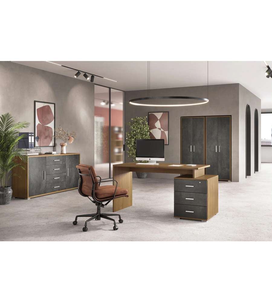 Descrizione: Scrivania in legno nei colori noce e ossidiana nera, fornita in kit con comodino a 3 cassetti.