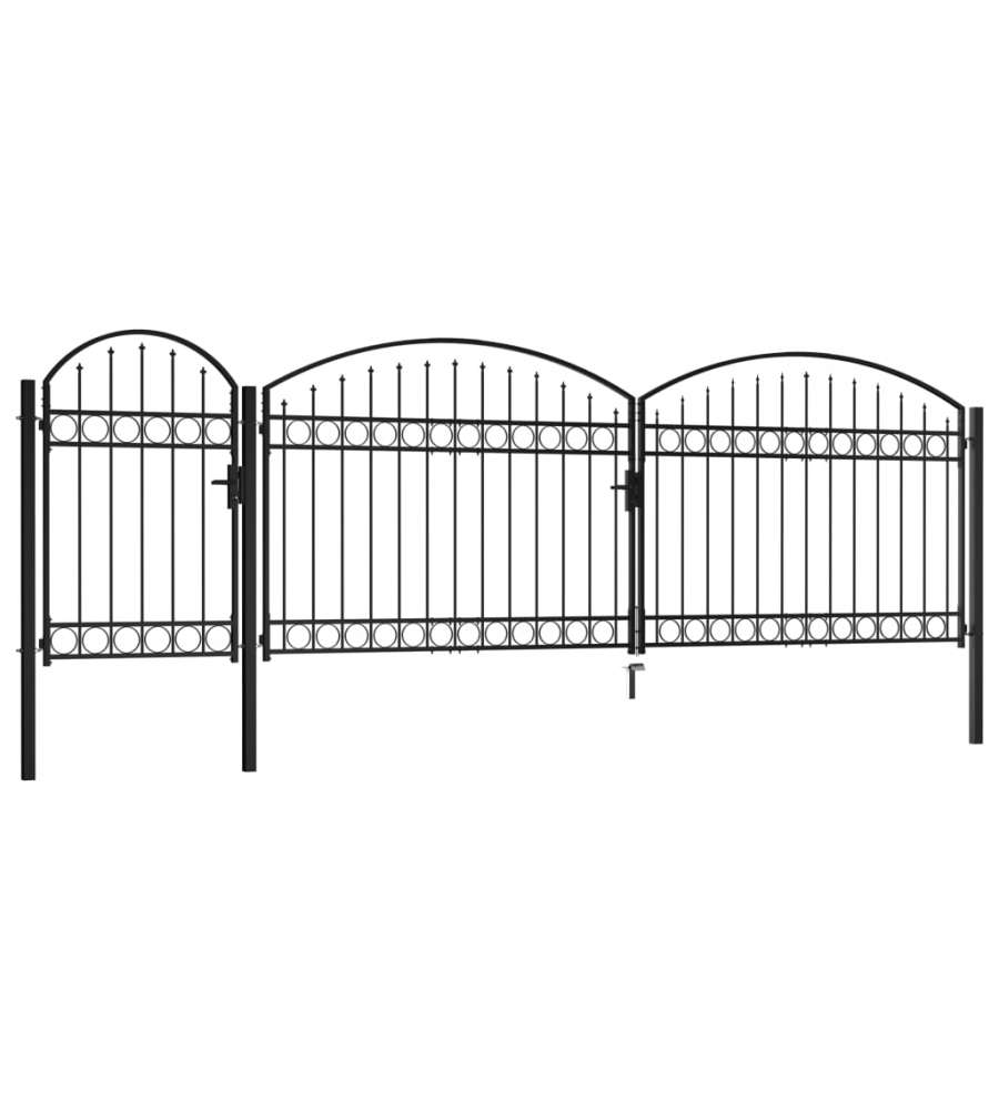 Grazie al design elegante e ad arco, e alle assi orizzontali che ne rinforzano il telaio, il nostro cancello da giardino offre un alto livello di sicurezza, formando un favoloso ingresso sulla vostra propriet?. Fabbricato in acciaio, il cancello ? verniciato a polvere contro la ruggine e la corrosione. In aggiunta, questo ingresso ? dotato di un sistema di bloccaggio e viene fornito con tre pali robusti, insieme a resistenti cerniere, per una facile installazione. Inoltre le barre di chiusura incluse facilitano il fissaggio in posizione delle due met? del cancello, conferendo una maggiore sicurezza. Questo cancello da giardino costituisce un'eccellente combinazione di stile, forza e robustezza!
