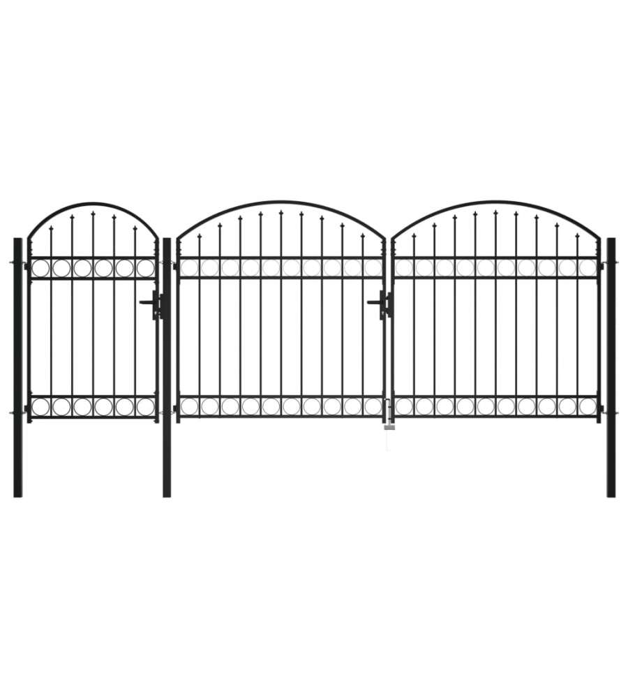 Grazie al design elegante e ad arco, e alle assi orizzontali che ne rinforzano il telaio, il nostro cancello da giardino offre un alto livello di sicurezza, formando un favoloso ingresso sulla vostra propriet?. Fabbricato in acciaio, il cancello ? verniciato a polvere contro la ruggine e la corrosione. In aggiunta, questo ingresso ? dotato di un sistema di bloccaggio e viene fornito con tre pali robusti, insieme a resistenti cerniere, per una facile installazione. Inoltre le barre di chiusura incluse facilitano il fissaggio in posizione delle due met? del cancello, conferendo una maggiore sicurezza. Questo cancello da giardino costituisce un'eccellente combinazione di stile, forza e robustezza!