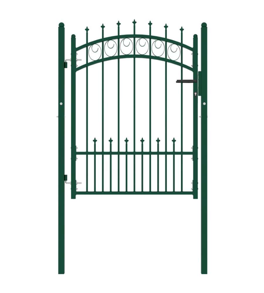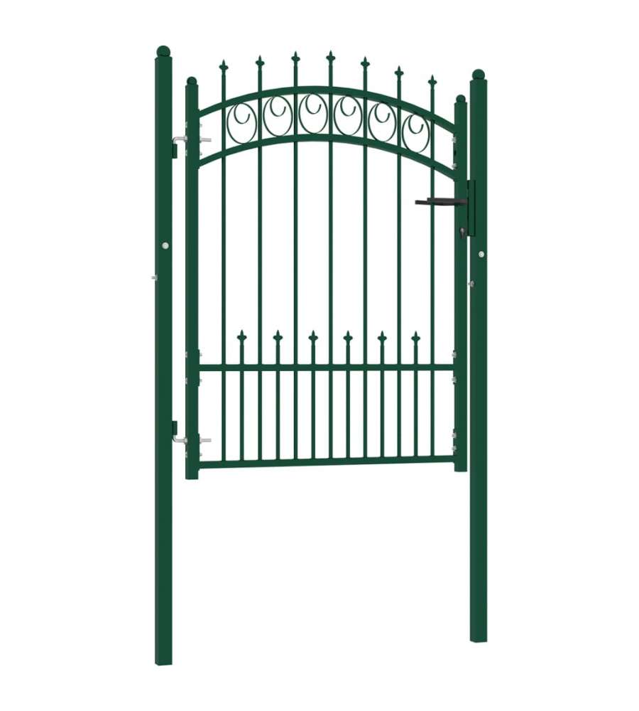 Fabbricato in acciaio robusto, il cancello d'ingresso ? verniciato a polvere per resistere a ruggine e corrosione. Grazie alle barre verticali con punte e ai robusti sostegni orizzontali di rinforzo per il telaio, il nostro cancello da giardino offre la massima sicurezza. In aggiunta, il design ad arco conferisce un tono elegante all'ingresso. ? inoltre dotato di una serratura con tre chiavi e viene fornito con due pali robusti, dotati di resistenti cerniere, per una facile installazione.