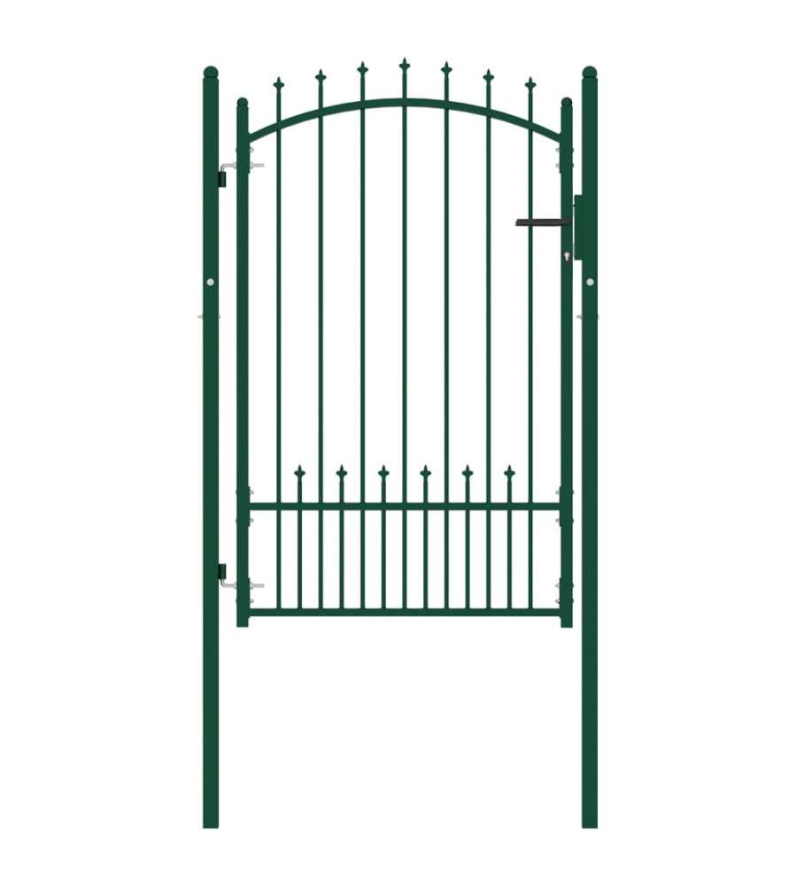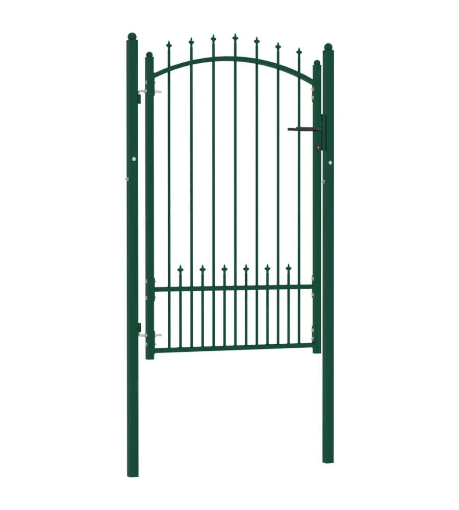 Fabbricato in acciaio robusto, il cancello d'ingresso ? verniciato a polvere per resistere a ruggine e corrosione. Grazie alle barre verticali con punte e ai robusti sostegni orizzontali di rinforzo per il telaio, il nostro cancello da giardino offre la massima sicurezza. In aggiunta, il design ad arco conferisce un tono elegante all'ingresso. ? inoltre dotato di una serratura con tre chiavi e viene fornito con due pali robusti, dotati di resistenti cerniere, per una facile installazione.