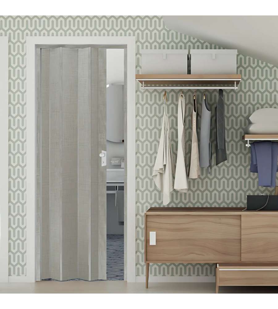 Porta a soffietto in PVC, colore grigio tessuto. Sistema di apertura reversibile, ingombro minimo grazie ai profili da 8 mm. Include binario di scorrimento da 120 cm. Leggera (5,3 kg) e design pratico per ottimizzare gli spazi.Uso interno: