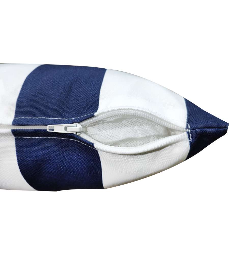 Cuscino da esterno, 43 x 43 cm, in poliestere filato con trattamento UV. Design a righe blue navy, idrorepellente, con cerniera, resistente alla luce solare per 500 ore.Uso esterno: