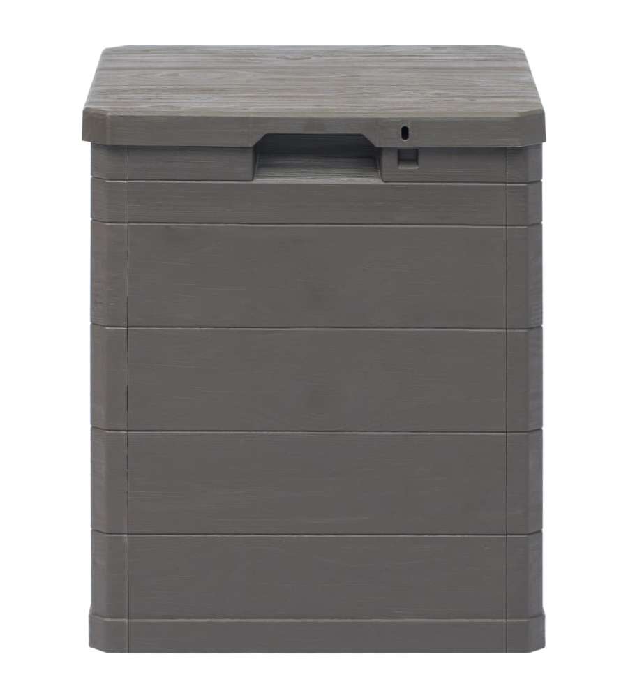 Colore: Marrone Materiale: Plastica (con texture legno) Dimensioni: 42,5 x 44 x 50 cm (L x P x A) Capacità: 90 L Chiudibile a chiave (serratura non inclusa) Adatto sia per uso interno che esterno