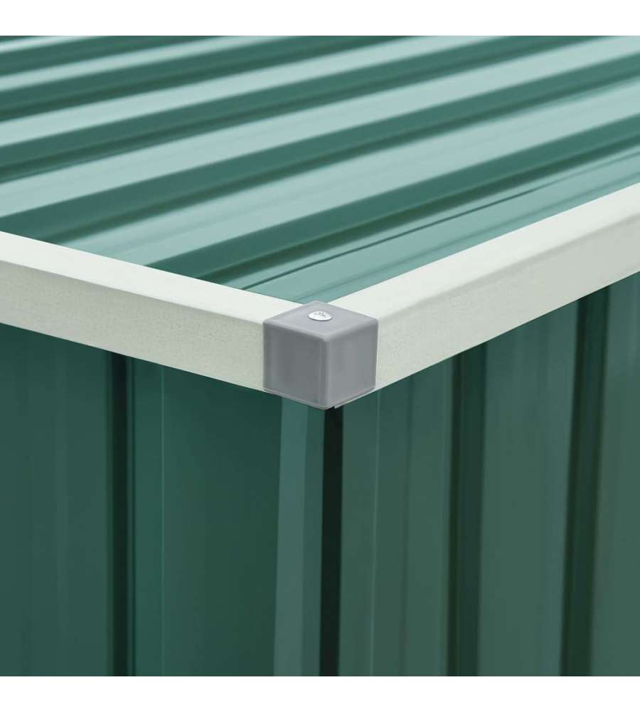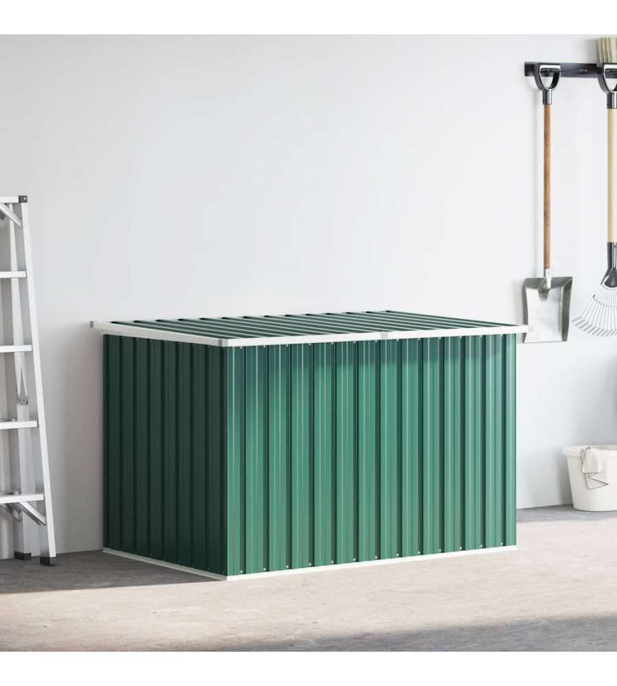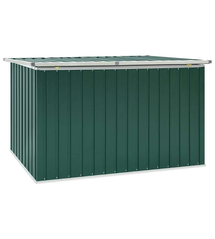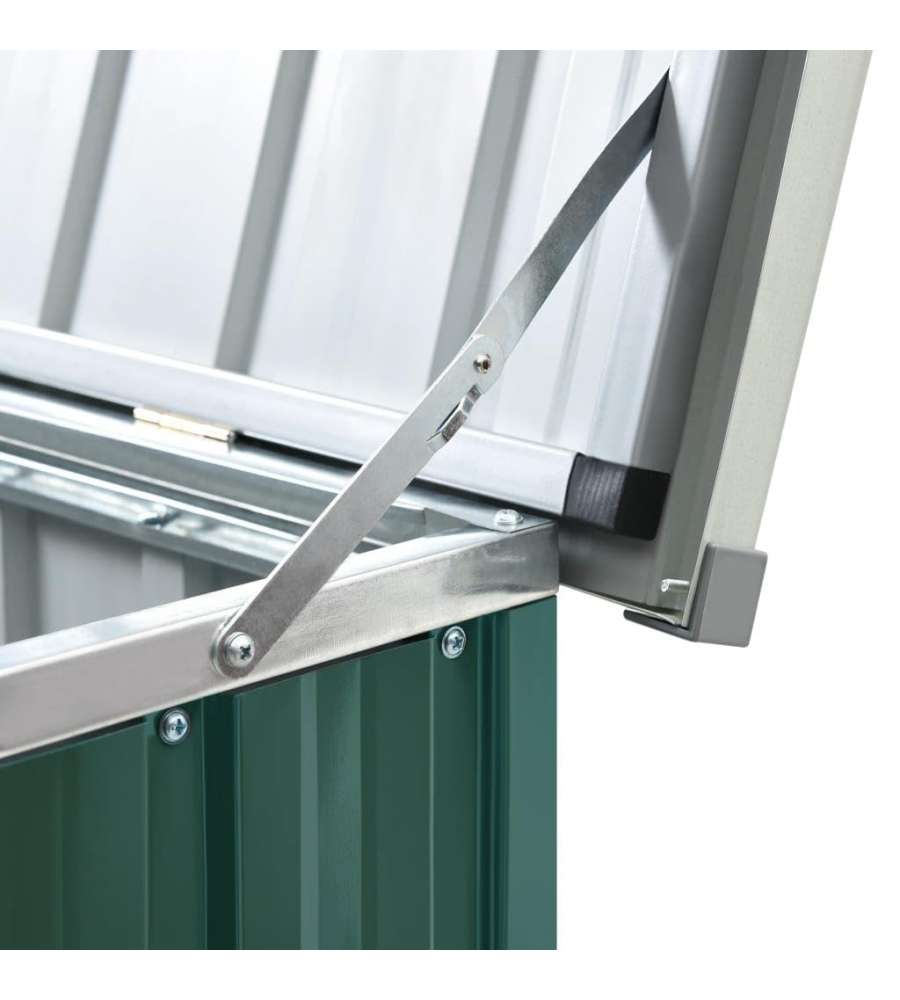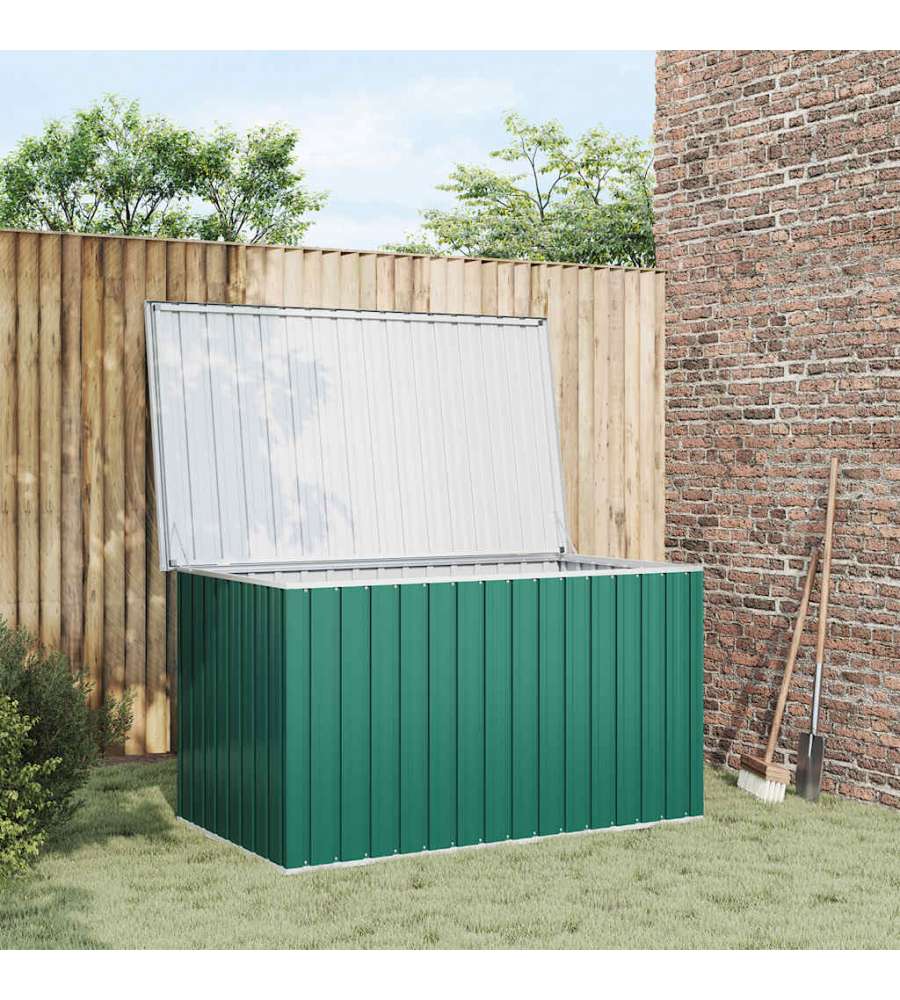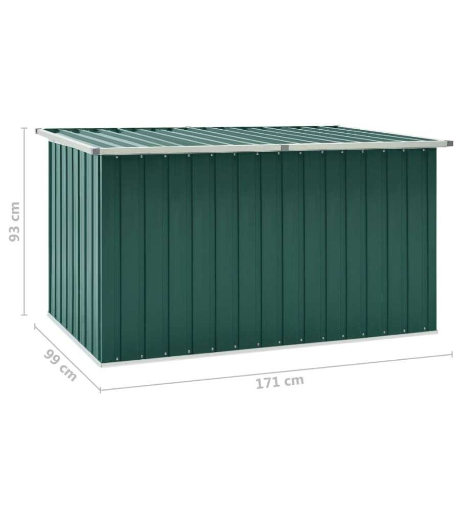 Baule da giardino verde in acciaio zincato, resistente alle intemperie. Dimensioni 171x99x93 cm, capacità 1,195 m³. Ideale per riporre cuscini e attrezzi, con coperchio a cerniera per facile accesso. Assemblaggio richiesto.Capacità: