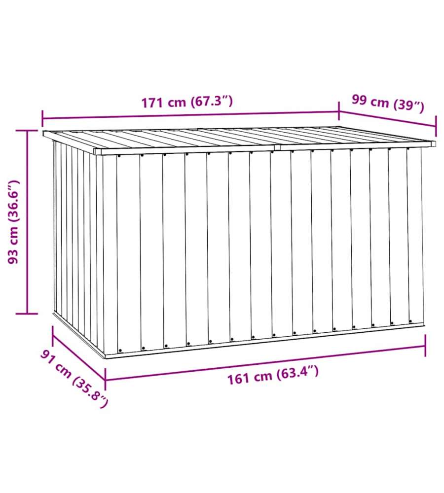 Descrizione: Baule da Giardino Verde 171x99x93 cm di vidaXL, ideale per riporre cuscini, coperte e giocattoli. Realizzato in acciaio zincato, resistente alle intemperie. Design elegante e facile apertura con coperchio a cerniera.