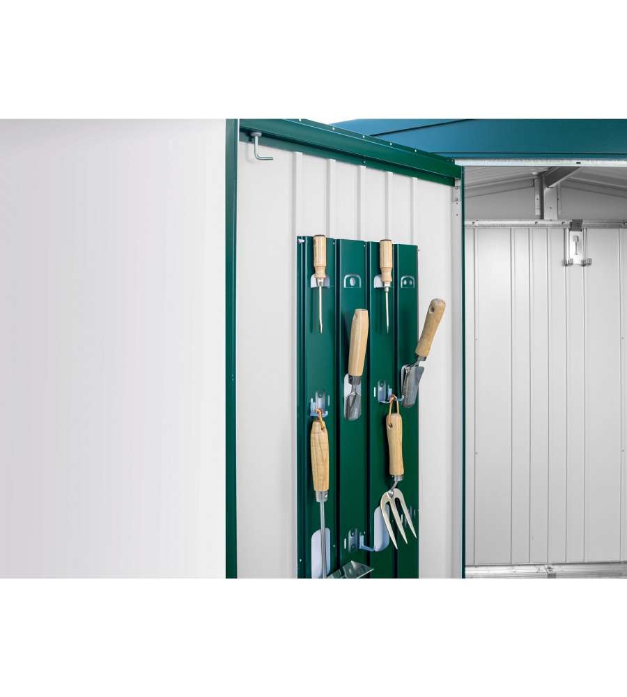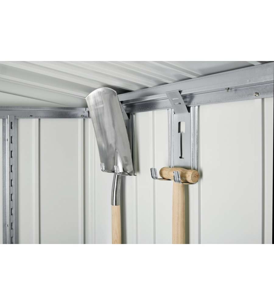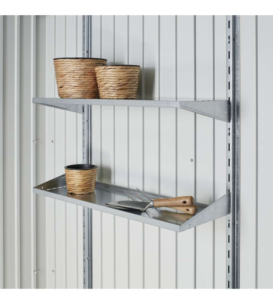 2 ripiani, 4 ganci porta attrezzi, sistema di riordino integrato, grondaie integrateCaratteristiche: