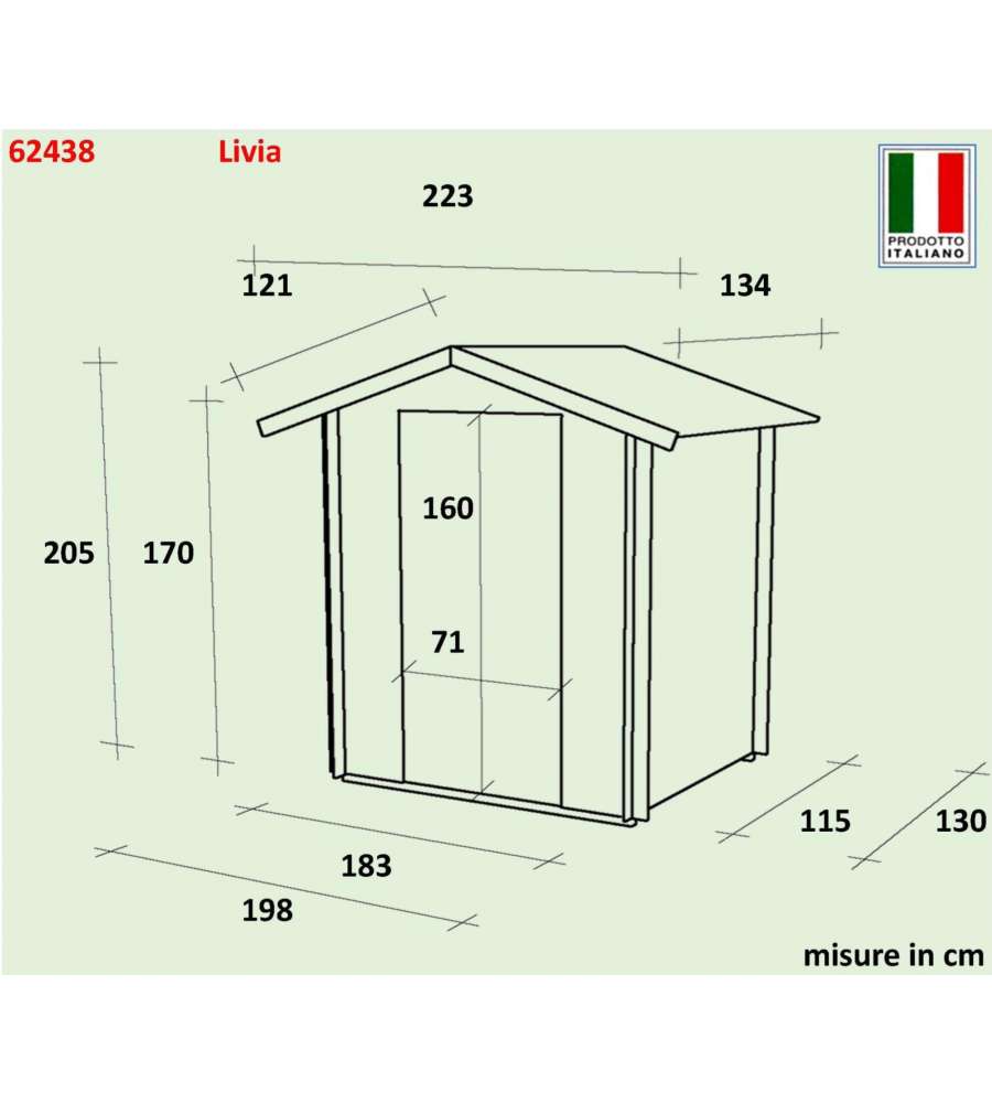 PORTA SINGOLA CIECA A BATTENTE + FINESTRA FRONTALE; falde tetto in pannello OSB3 spessore 12mm, copertura con guaina ardesiata grigia da 3 mm; pavimento in OSB3 spessore 12mm con listelli d'appoggio impregnati in autoclave;Certificazioni: