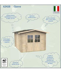 Dotata di TRAVE di fondazione impregnata in autoclave, pavimento in perlinato di abete di 16mm con listelli d'appoggio impregnati in autoclave; fornita in kit comprensivo di ferramenta e istruzioni di montaggio