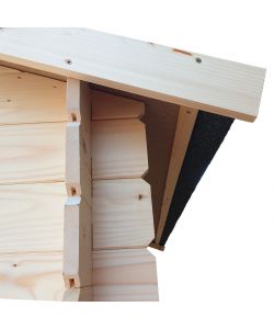 Falde tetto in perlina d'abete naturale sp.19mm, copertura con guaina ardesiata grigia da 3mm; pavimento in perlina d'abete naturale sp.19mm con listelli d'appoggio impregnati in autoclave;Certificazioni:
