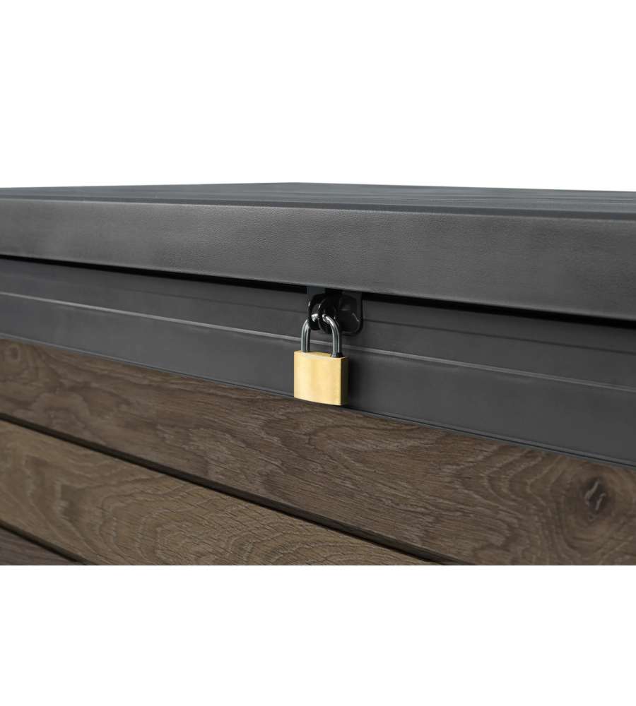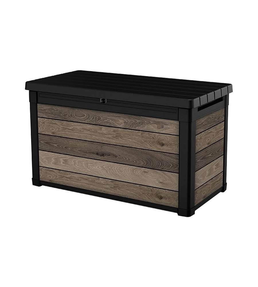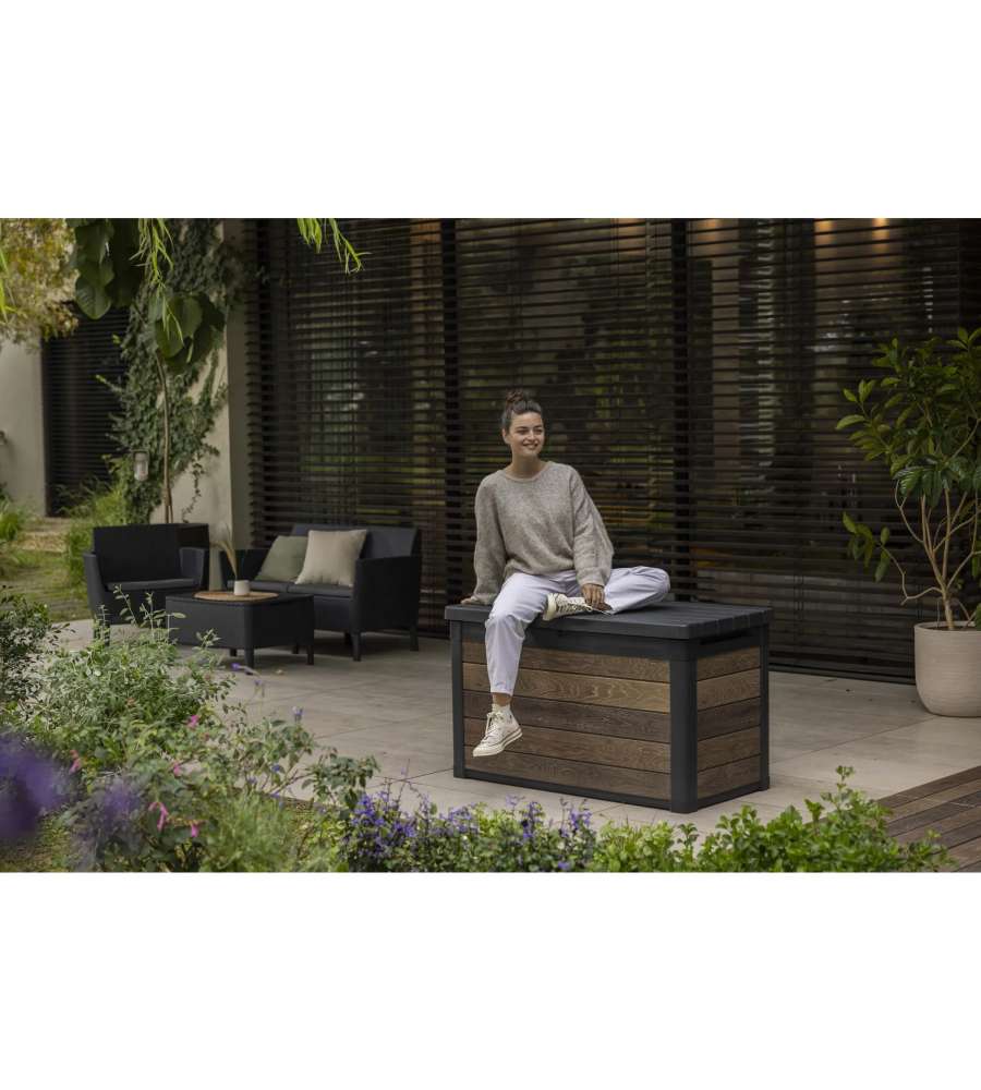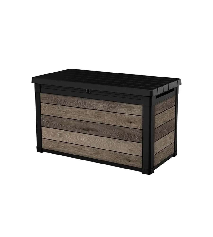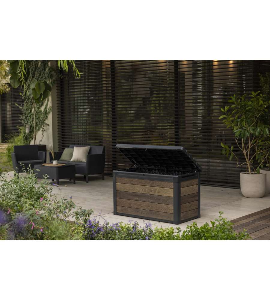 Descrizione: Scopri il Baule Keter Signature Deco Box 100 in effetto legno, capiente 380L, resistente agli agenti atmosferici e lucchettabile. Apertura facilitata con pistoni laterali, ideale per contenere e arredare.