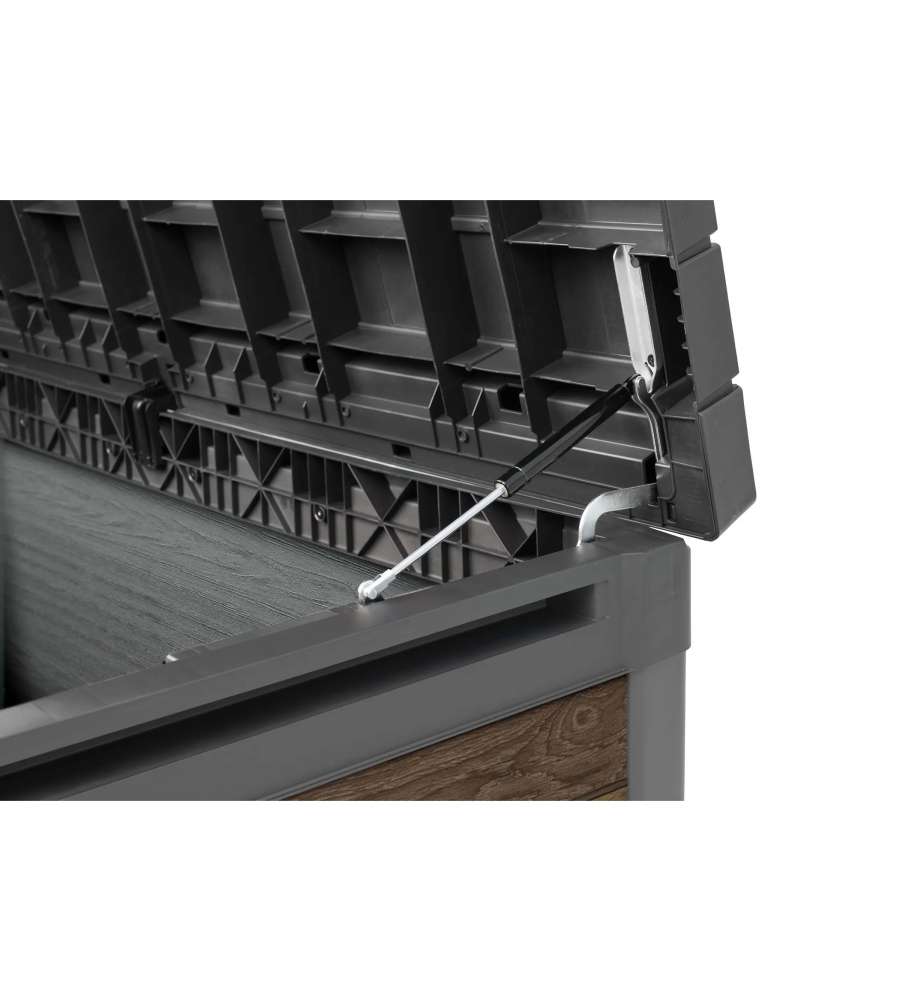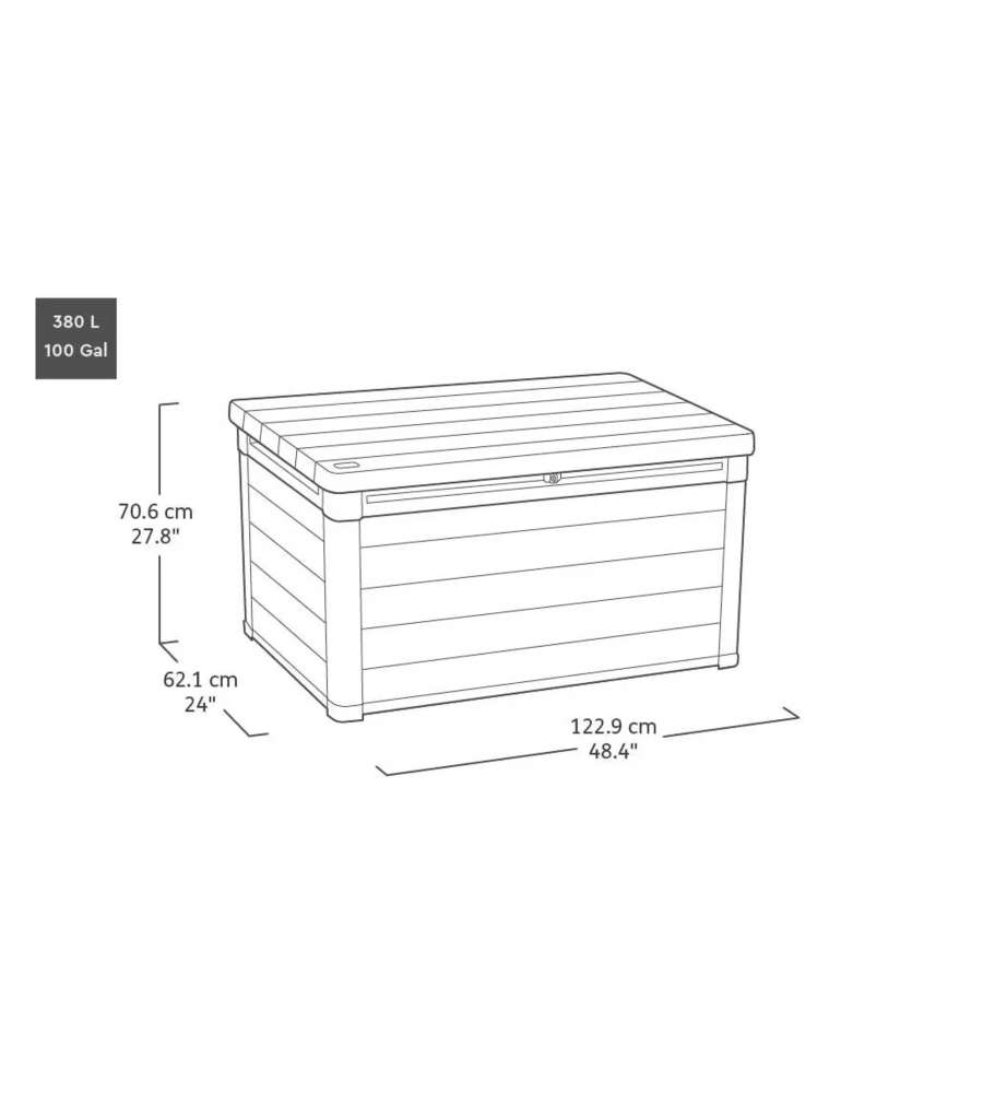 Baule in resina effetto legno con capacità di 380 litri, resistente agli agenti atmosferici e ai raggi UV. Sistema di apertura facilitata con pistoni, lucchettabile e adatto per la seduta di due adulti. Dimensioni: 122.9x62.1x70.6 cm.Capacità: