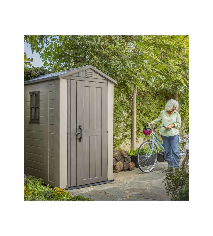 Casetta da giardino Keter Factor in resina beige con dimensioni di 129,5 x 188,5 x 216,5 cm. Struttura a doppio strato, pavimento incluso, chiusura lucchettabile, finestra laterale e fori di ventilazione. Resistente a UV e intemperie. Montaggio facilCapacità: