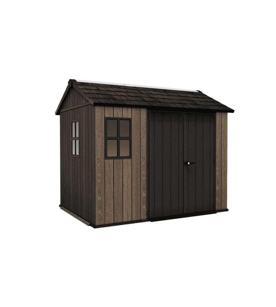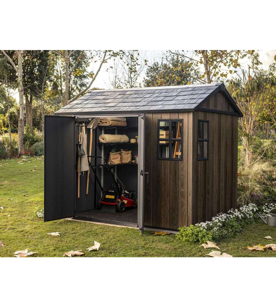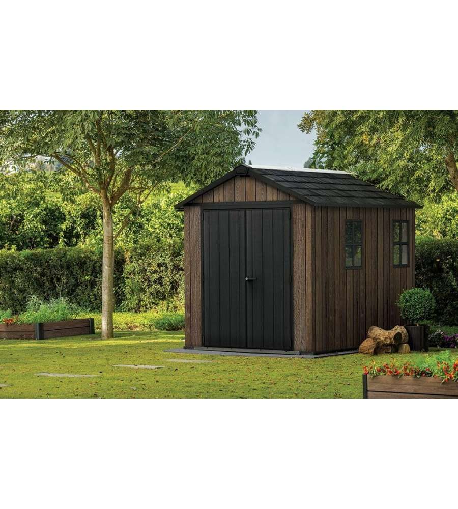 Casetta da giardino Keter in resina Deco Coat effetto legno, dimensioni 230x287xH246 cm. Ampio spazio interno, resistenza a neve (150 kg/m²) e vento (145 km/h), doppio ingresso, finestre e lucernario per illuminazione naturale, senza manutenzione.Capacità: