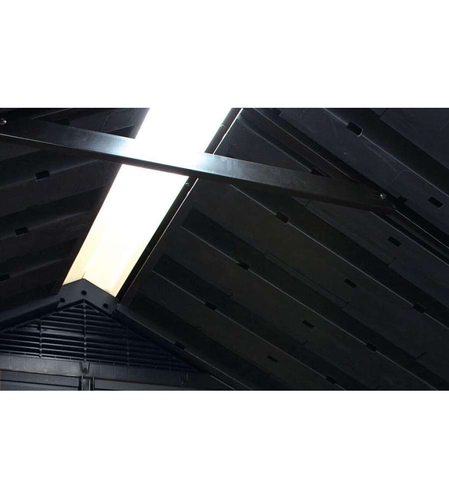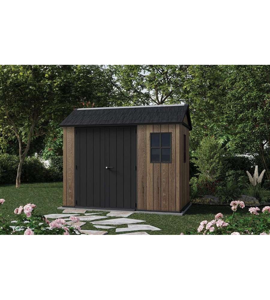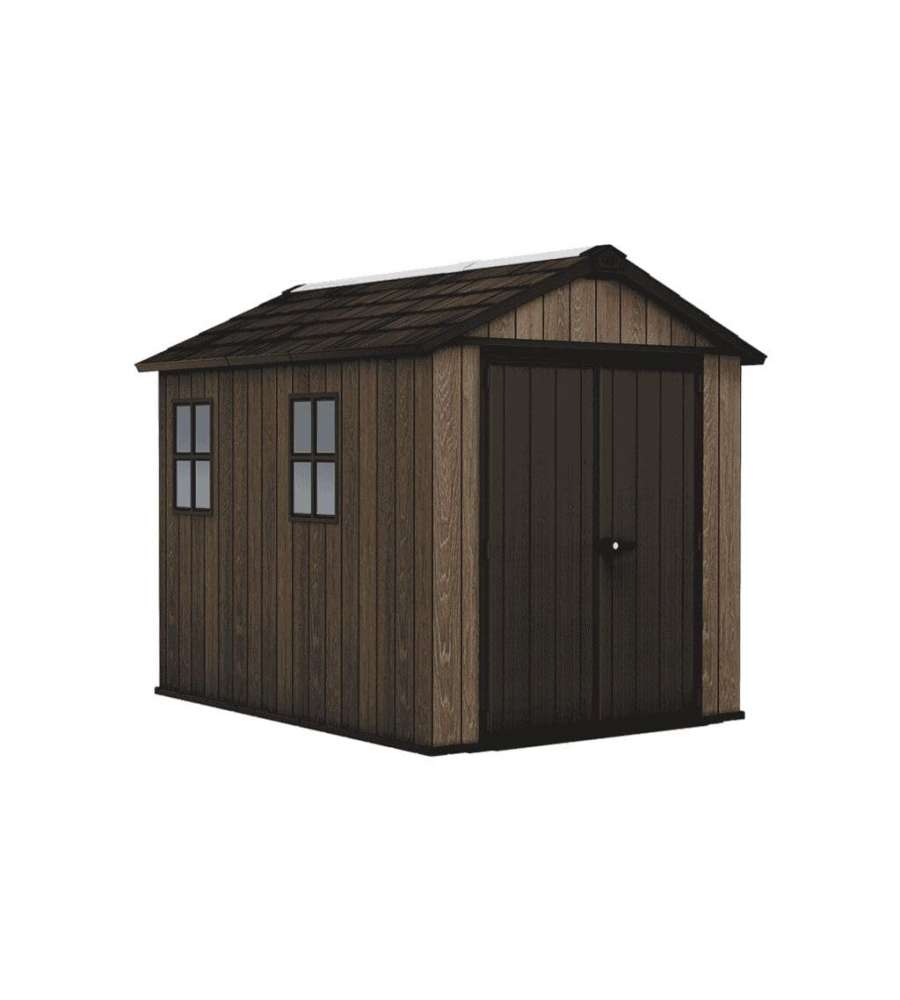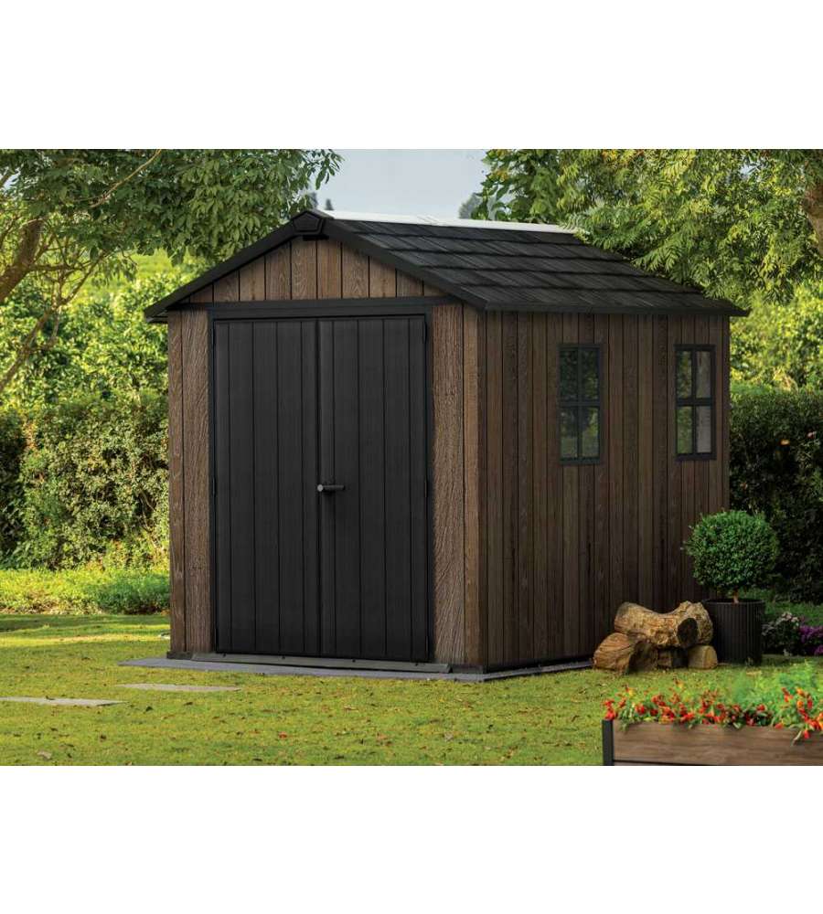 Casetta da giardino Keter in resina Deco Coat effetto legno, dimensioni 230x287xH246 cm. Ampio spazio interno, resistenza a neve (150 kg/m²) e vento (145 km/h), doppio ingresso, finestre e lucernario per illuminazione naturale, senza manutenzione.Capacità: