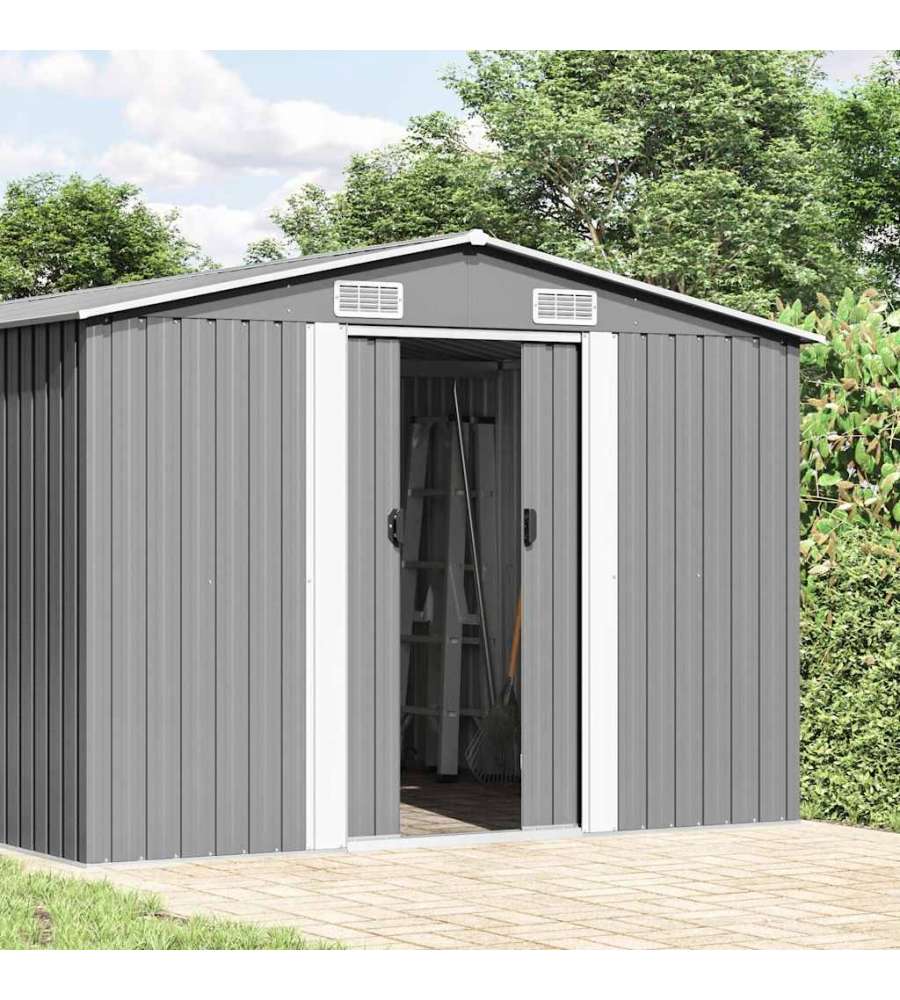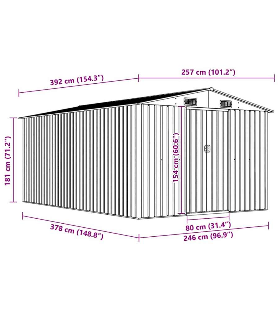 Capanno da giardino in metallo grigio, dimensioni 257x392x181 cm. Robusto e spazioso, ideale per riporre attrezzi e mobili da giardinaggio. Resistente alle intemperie, con prese d'aria per ventilazione e doppie porte scorrevoli.Superficie: