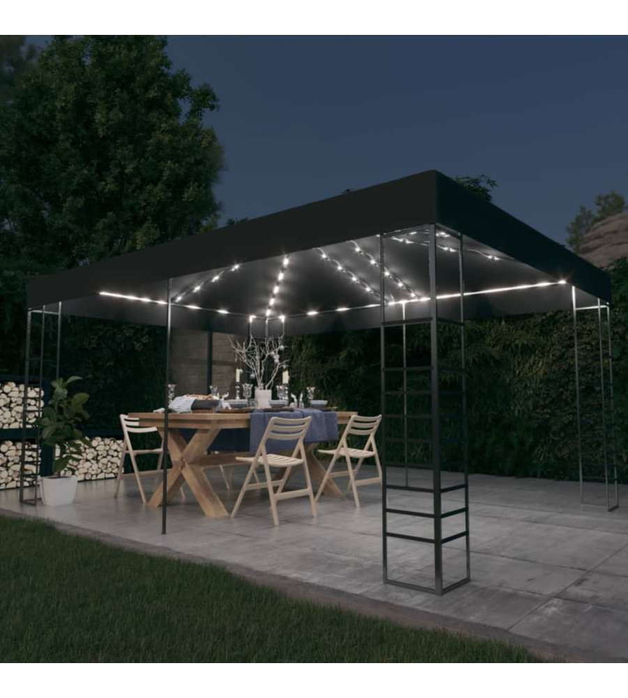 Il baldacchino ventilato impedir? al sole e alla pioggia di rovinare il divertimento durante le riunioni di famiglia, i barbecue, i picnic pomeridiani e le feste di compleanno. La tenda per feste ha una robusta struttura in acciaio con dettagli quadrati decorativi e un tetto in poliestere al 100%. Questo prodotto ? facile da montare. Inoltre, la luce della stringa crea un'atmosfera accogliente nel vostro giardino quando il sole tramonta. Le luci non inquinano l'ambiente in quanto vengono caricate dall'energia solare durante il giorno.