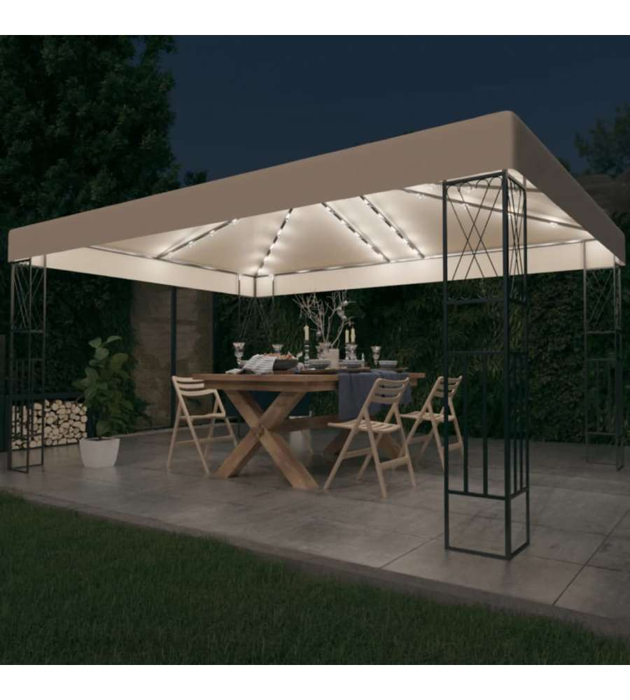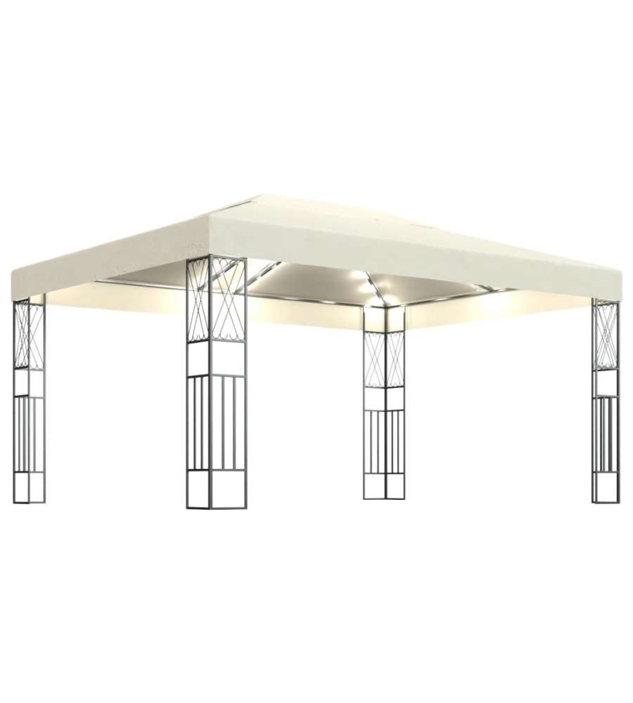 Il baldacchino ventilato impedirà al sole e alla pioggia di rovinare il divertimento durante le riunioni di famiglia, i barbecue, i picnic pomeridiani e le feste di compleanno. Il gazebo ha una robusta struttura in acciaio con dettagli decorativi a forma di croce e un tetto in poliestere. Il baldacchino può essere facilmente fissato al telaio in acciaio. Inoltre, la luce della stringa crea un'atmosfera accogliente nel vostro giardino quando il sole tramonta. Le luci non inquinano l'ambiente in quanto vengono caricate dall'energia solare durante il giorno.