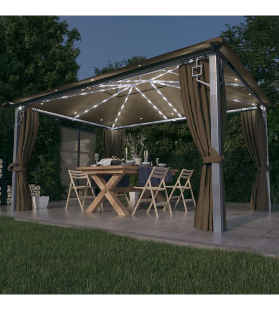 Il tetto, realizzato in tessuto Oxford con verniciatura PA, vi protegge dall'abbagliamento e dai dannosi raggi UV della luce solare diretta. Il gazebo ? solidamente costruito in alluminio robusto e acciaio, ed ? quindi resistente alla ruggine e molto stabile. Il padiglione viene consegnato con 4 pareti laterali, che possono essere tirate in caso di maltempo. Sono inclusi anche schermi a rete per tenere lontani gli insetti e garantire la buona circolazione dell'aria. La chiusura a strappo ? inclusa per un facile fissaggio. Inoltre, la luce della stringa crea un'atmosfera accogliente nel vostro giardino quando il sole tramonta. Le luci non inquinano l'ambiente in quanto vengono caricate dall'energia solare durante il giorno.