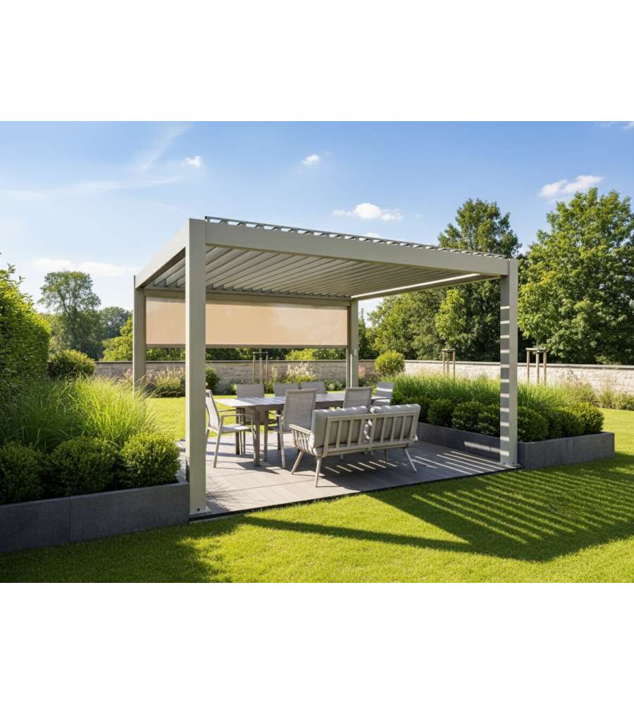 Descrizione: Scopri la Pergola Bioclimatica Ulivo in Alluminio 4x4 m Beige di Giardini di Maggio, altezza 2,58 m. Struttura resistente, lamelle motorizzate e illuminazione LED per il massimo comfort all'aperto. Ideale per ogni giardino!