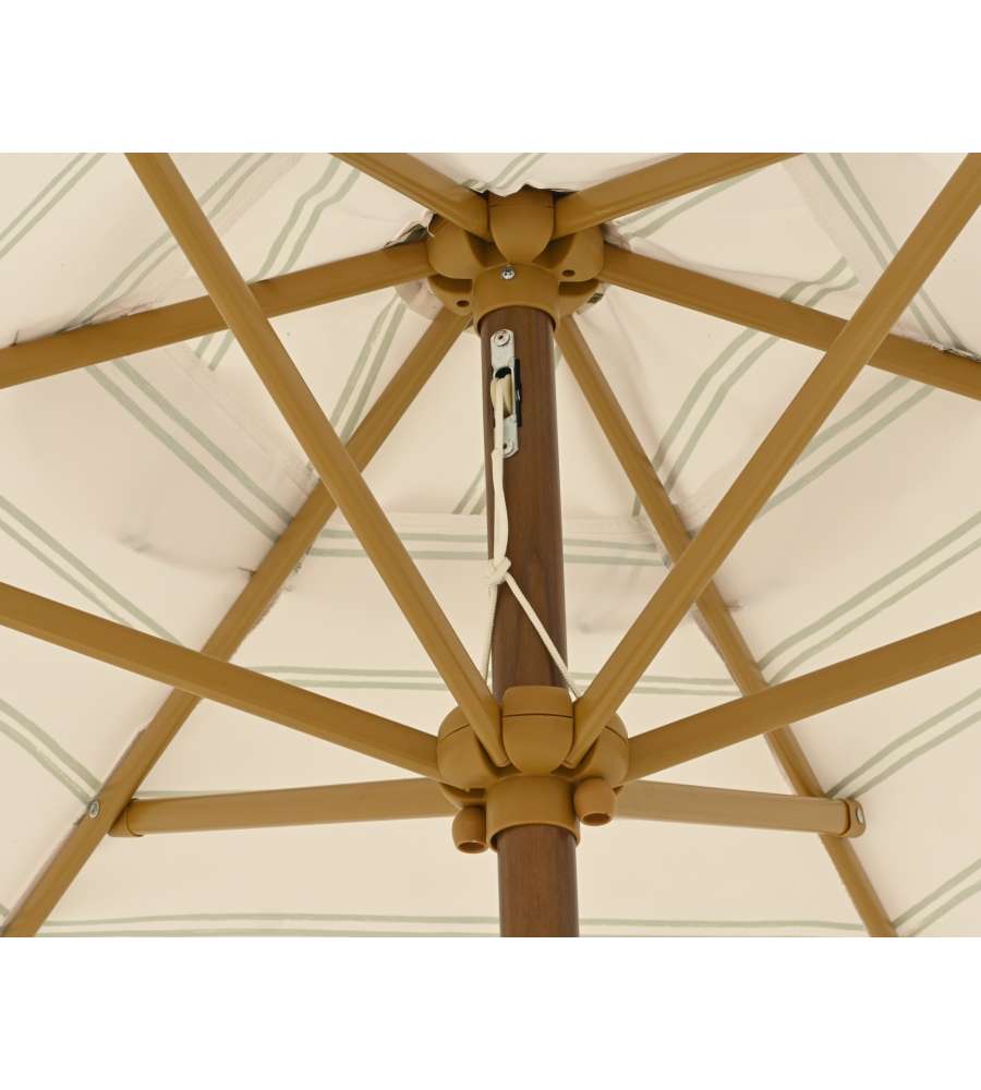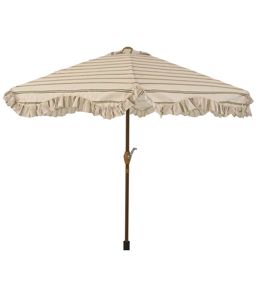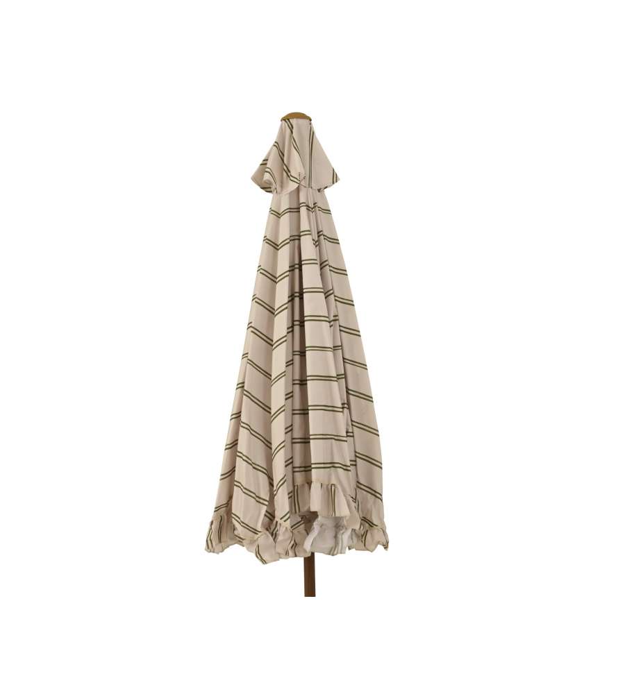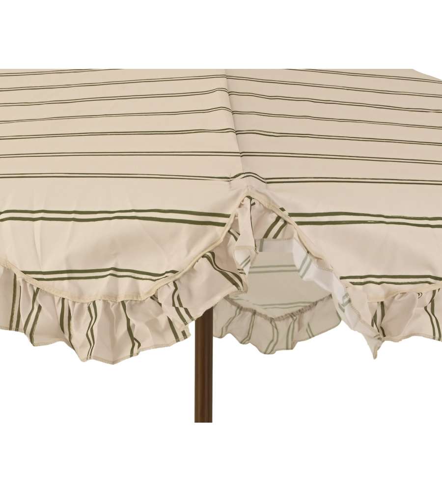 Ombrellone da esterno con copertura beige, diametro 220 cm e altezza regolabile fino a 210 cm. Telo in poliestere 180 g/m², struttura in ferro, manovella per apertura facile, design elegante con volant e righe verdi. Peso 3,7 kg. UVPF 30.Materiale struttura: