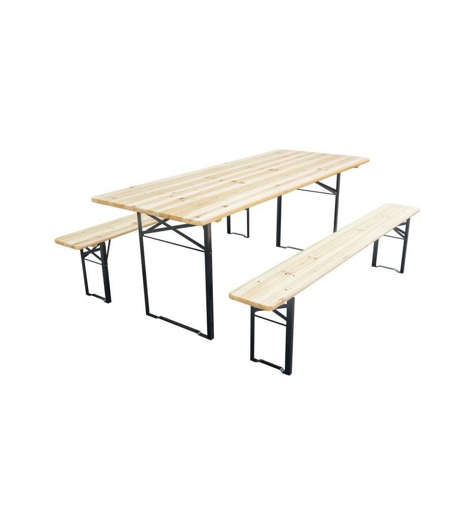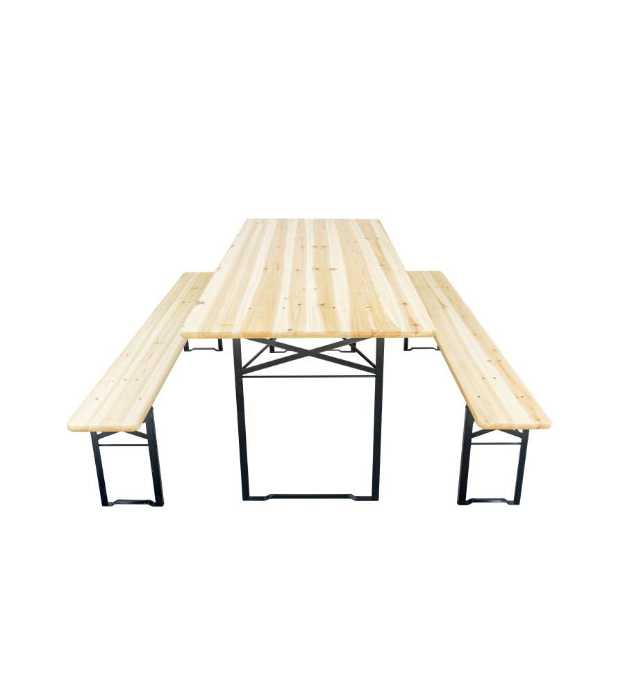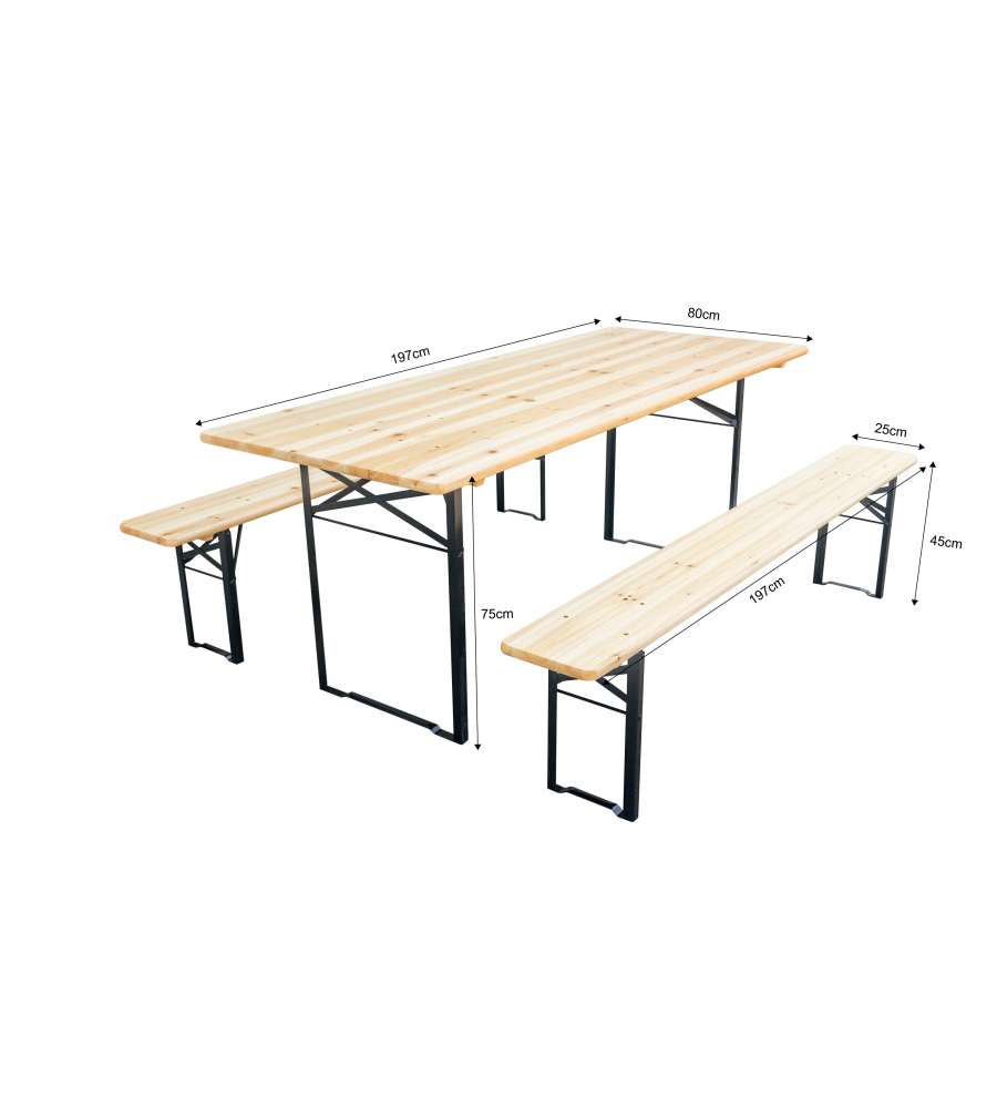 Set birreria con tavolo 200x80 cm e 2 panche 200x25 cm. Altezza tavolo 75 cm, panche 45 cm. Realizzato in legno di abete colore naturale con gambe in acciaio verniciato nero. Richiudibile e salvaspazio. Perfetto per feste. Peso 32 kg.Altezza piano: