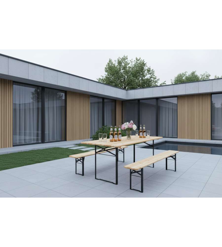 Il Set Birreria Richiudibile in Legno è l'ideale per chi ama organizzare eventi all'aperto. Grazie alla sua struttura robusta in legno di abete e gambe in acciaio, offre stabilità e resistenza, pur mantenendo un design elegante e naturale. Questo set è facilmente richiudibile, occupando poco spazio quando non in uso, rendendolo perfetto per chi ha esigenze di spazio limitato. Che si tratti di una festa in giardino, un picnic o un evento formale, questo set si adatta a tutte le esigenze. Le panche sono comode e offrono un'ottima soluzione per sedere più persone, rendendo ogni incontro speciale.