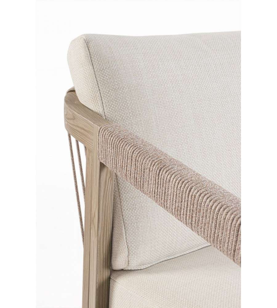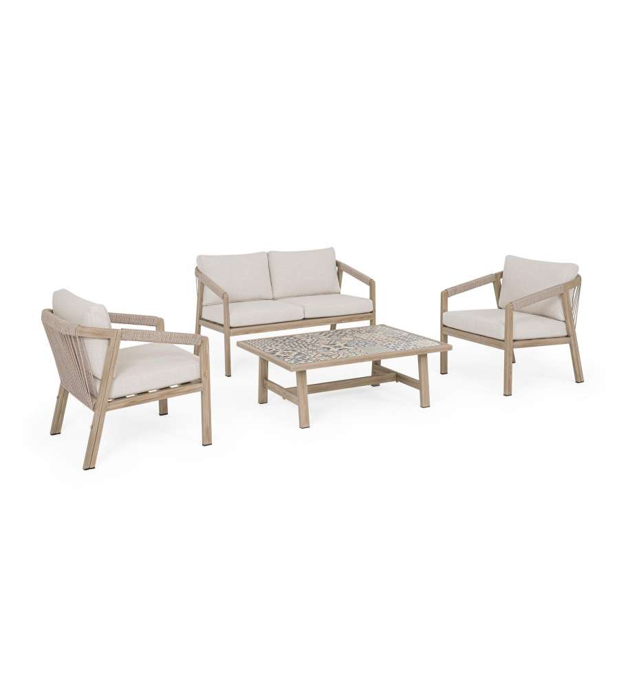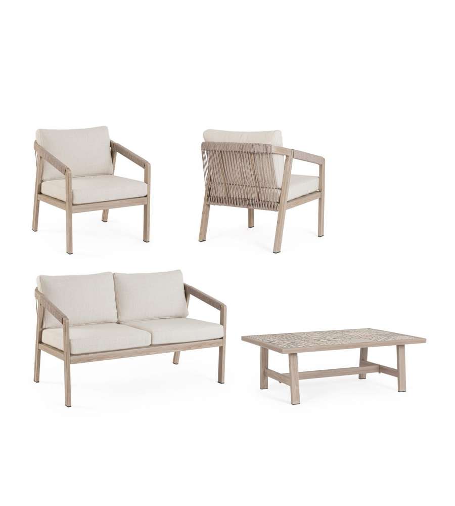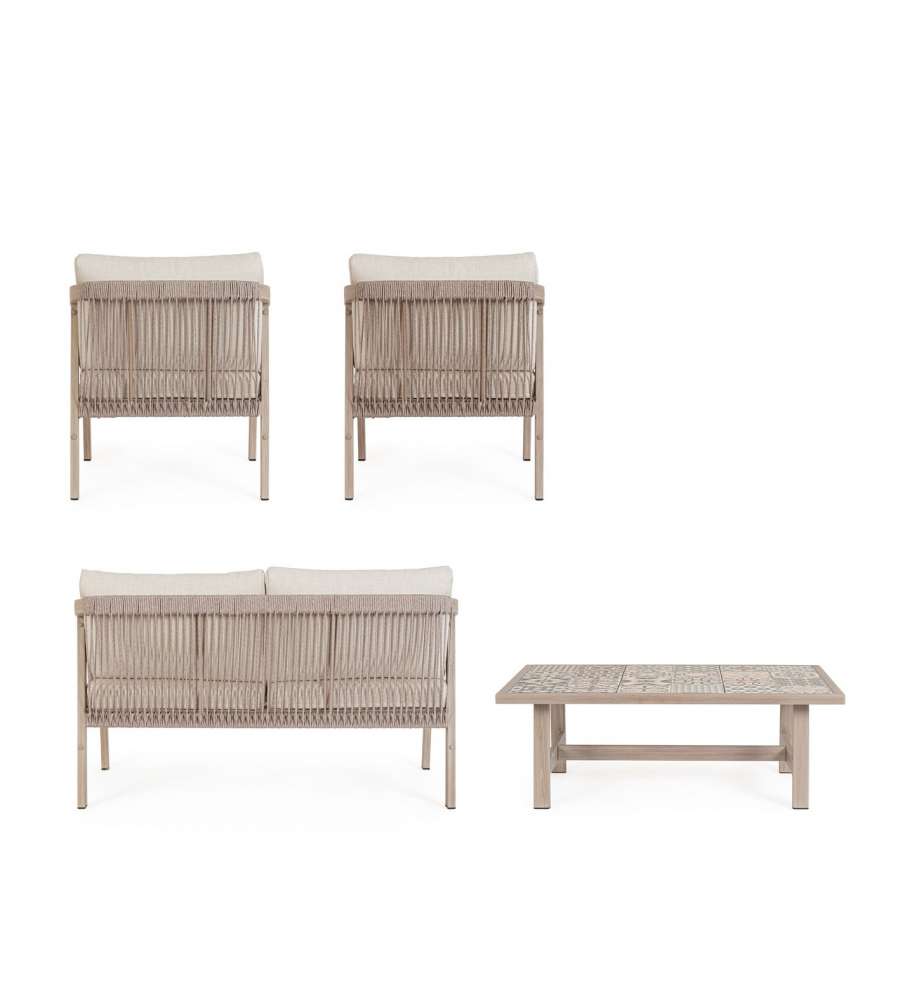 Set da salotto Kalimera in alluminio verniciato effetto legno, con cuscini sfoderabili in tessuto idrorepellente. Piano tavolino in porcellana smaltata, resistente e facile da pulire. Elegante intreccio in corda di poliestere, viteria in acciaio inoxAltezza piano: